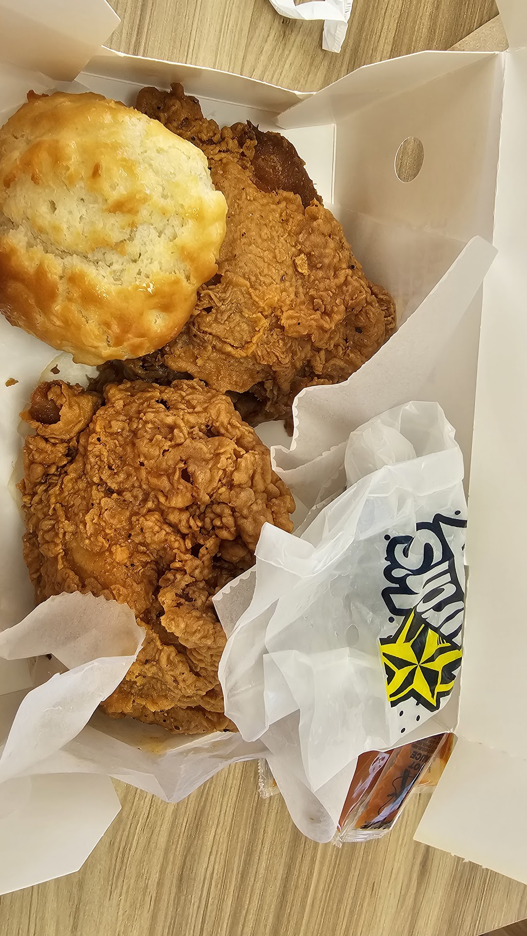 The logo changed here in Laredo, but it’s the same quality, same chicken. Actually the chicken was better than other cities I’ve been in. Service was ok. The jalapeño bombers are the same. Tasty! 😋. Biscuits are great here with the honey glaze. The fries are ok. I like the fact that they are crinkly… overall, pretty good than most spots I’ve been to that are fast food chicken places…. You know...
