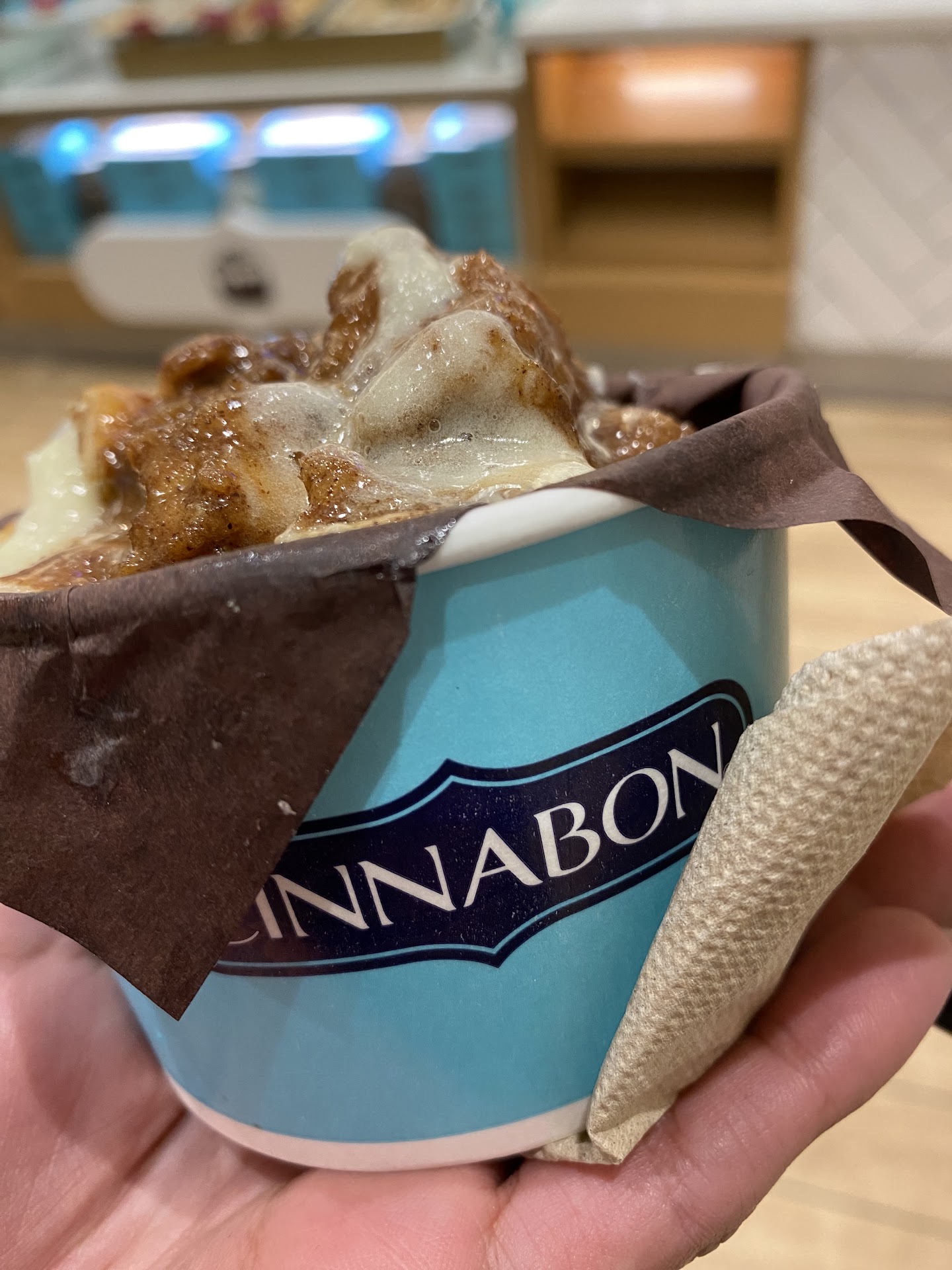 Read moreFirst time trying cinnabon and OMG best cinnamon rolls I've ever tried. They're fresh made and it's even warm when they're served. We asked for the classic roll which is kinda big, I'd say it's even enough for two people, and also ordered the "Center of the Roll" which is like a cup filled with bite size pieces of the center of cinnamon rolls, with caramel pecan on top (additional cost), which made it even sweeter but with a cup of unsweet coffee...