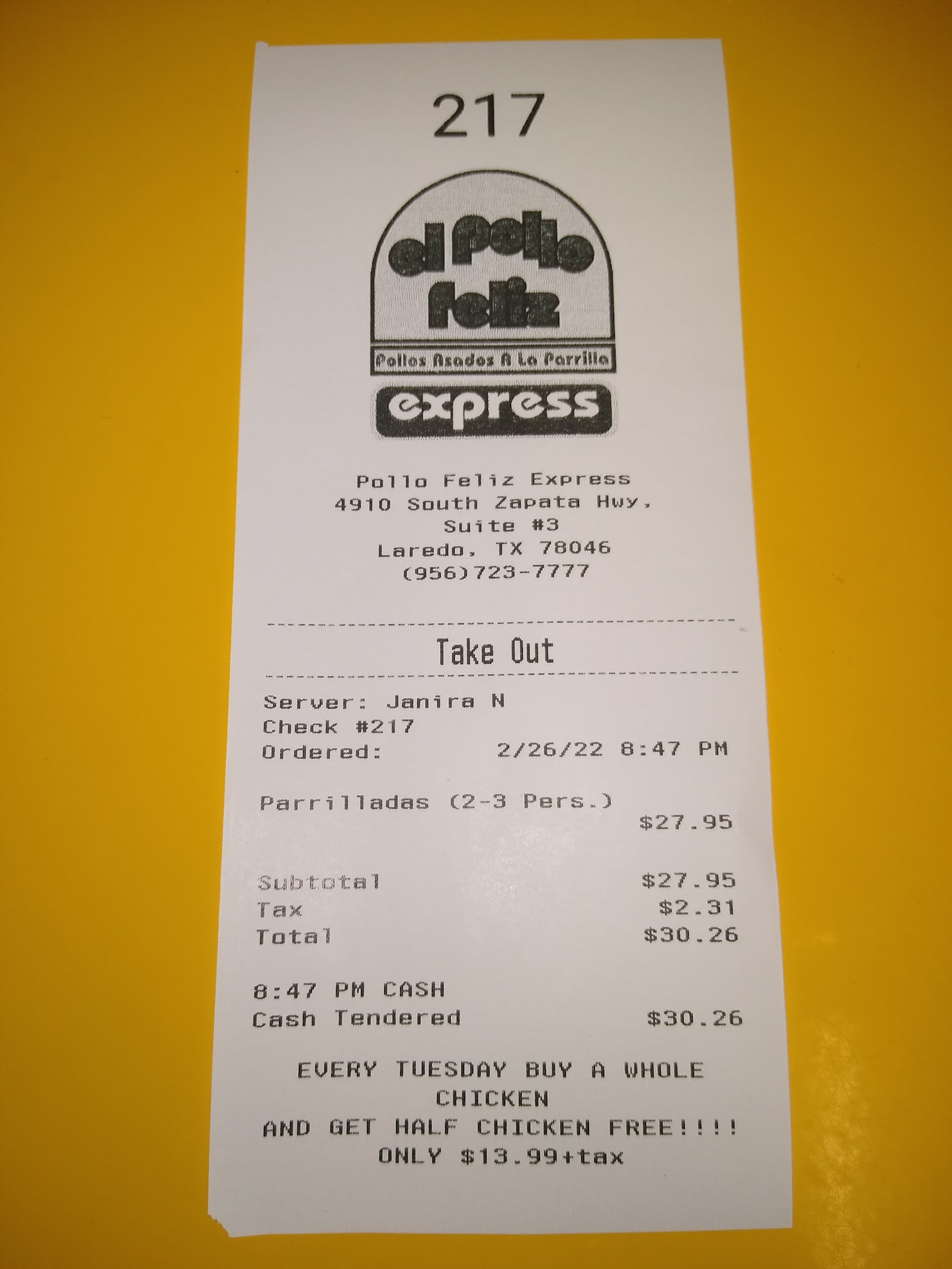 Read moreI asked that my highly sugary drink be exchanged for a cup of rancho beans. I am a 57 y.o. pre diabetic and had ordered the half chicken meal. I was turned down. (I explained she should read the book by Perkins "Give them the pickle" which shows businesses to see customers as the "boss" and make them say "I will be back"). She chuckled. I had chosen to travel via Laredo from Brownsville to Del Rio (not via Alice, a shorter, more pleasant route) so I could visit El Pollo Feliz. Food was great! But I will...