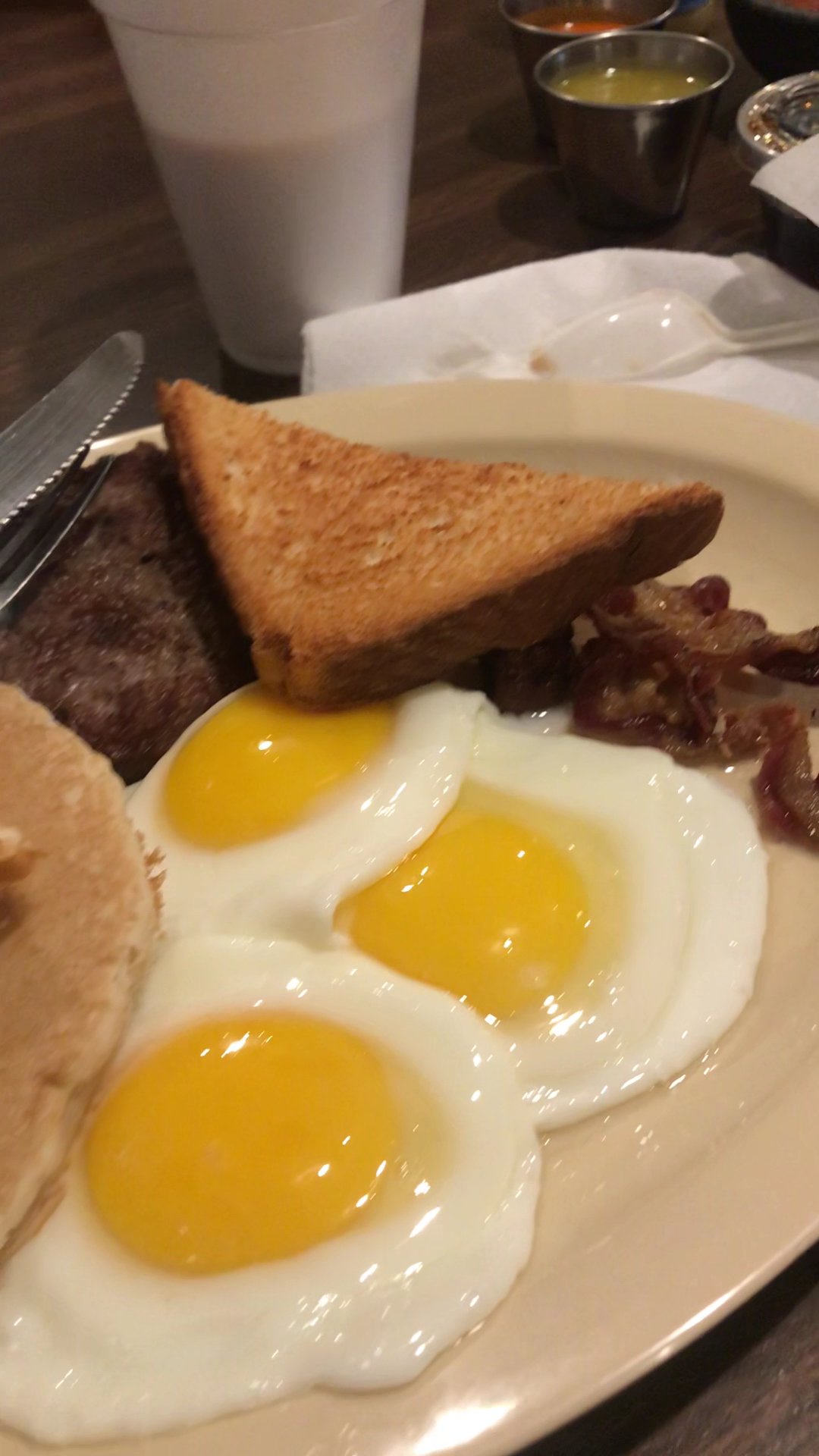 Breakfast tacos I tend to get: Bacon and egg with two bacon strips. There's a heft amount of bacon mixed with the eggs. Potatoes and eggs with two bacon strips with the tortilla crispy. THIS ONE IS MY FAVORITE! Everything sits well with each other. I've also had their breakfast sandwich, which I believe is called The Cowboy. They use a different sausage on that than they they with their sausage and egg tacos.