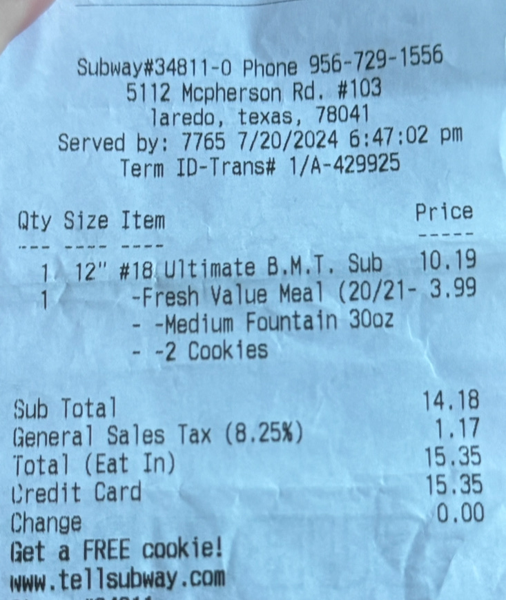 Read moreThis location itself seems empty but still all ingredients seem very fresh. The only negative I experienced was that they did not have any ice for the drinks, which really messes up your drink. For Subway itself, I canât believe they raised the prices so much, almost 50%! Last time I got a BMT combo was around $10. This last time was almost $16. Subway is definitely going to lose some business if they donât...