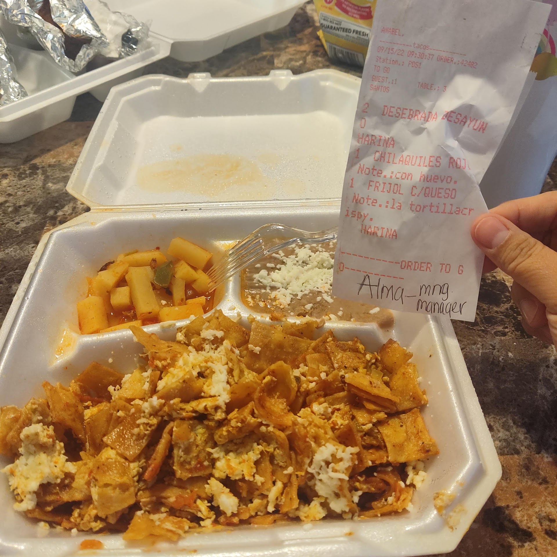 Read moreHorrible customer service!!! I ordered chilaquiles rojos with egg and a bean and cheese taco, and two desebrada tacos. First of all, I don't reside close to this restaurant so I can come and go. Got home and checked my order which was all wrong. The chilaquiles had no egg at all...just white cheese. The bean and cheese taco was missing. I got the two desebrada tacos. I would understand if they would have admitted to forgetting the items and apologizing, but supposedly the manager was the person I spoke with to make my complain and all she could say was, "let me ask the waitress." Then she comes back and said that the waitress stated that it wasn't in the order to go receipt that's why she didn't add the item. It is clearly stated on the receipt that I just posted. They clearly charged me for all the items. The manager couldn't even say, come back so I can correct the mistake but instead kept saying, "ah ah." She didn't know what to say. Never will I go back to this restaurant. Not a...