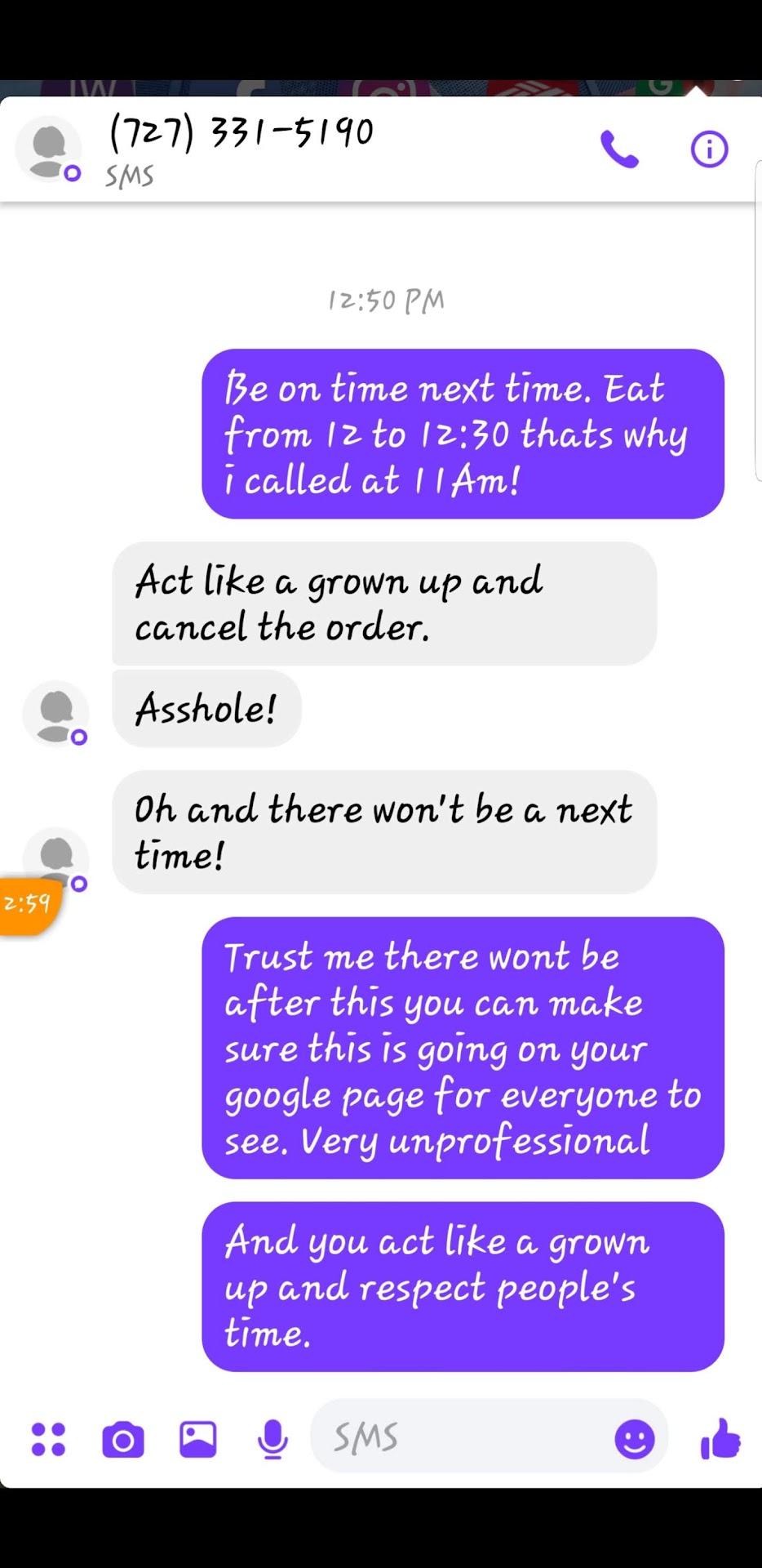 When I tried to tell the woman that our online receipt said a delivery time of 12:40, the woman immediately got defensive and told me she had just received our order and that it was a lot of food and that there was no way she was going to be able to get it to us in the time frame that we were told.