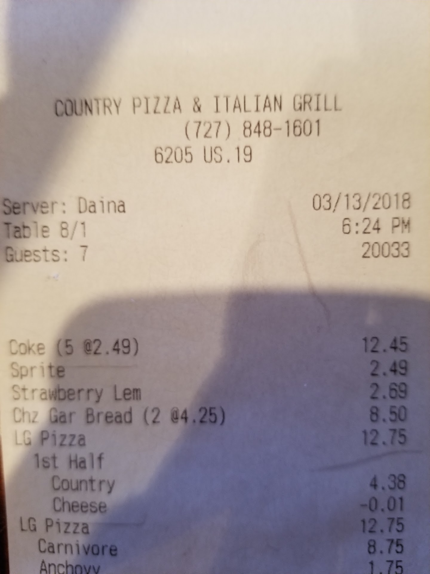 I had an unfortunate experience at Country Pizza Inn in Largo that I feel compelled to share. My visit last night left a lot to be desired, and I think it's important to highlight some of the issues I encountered.