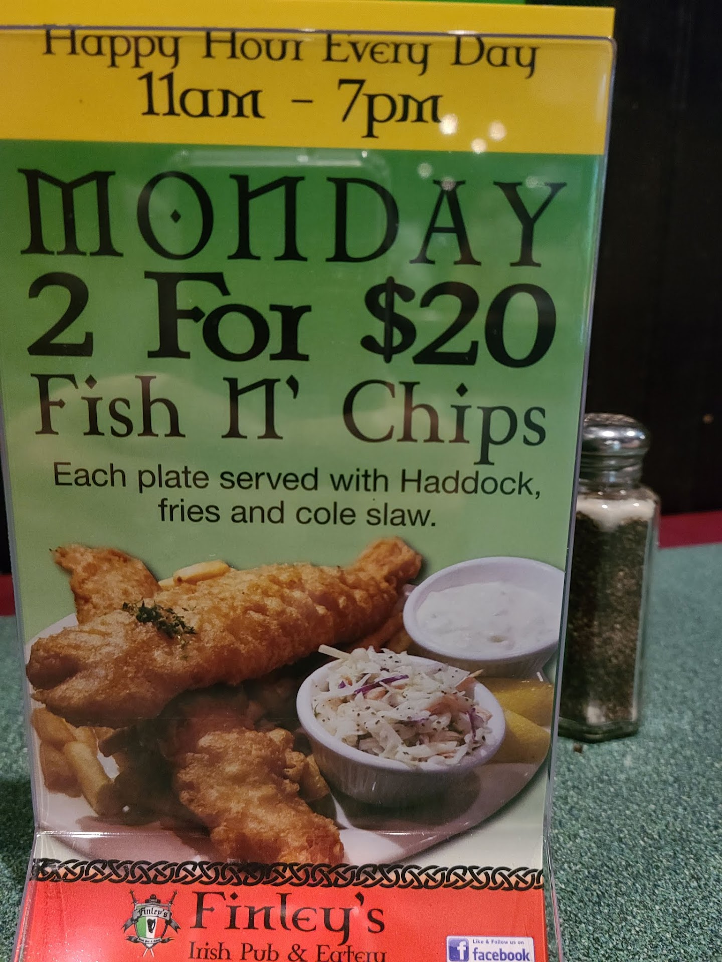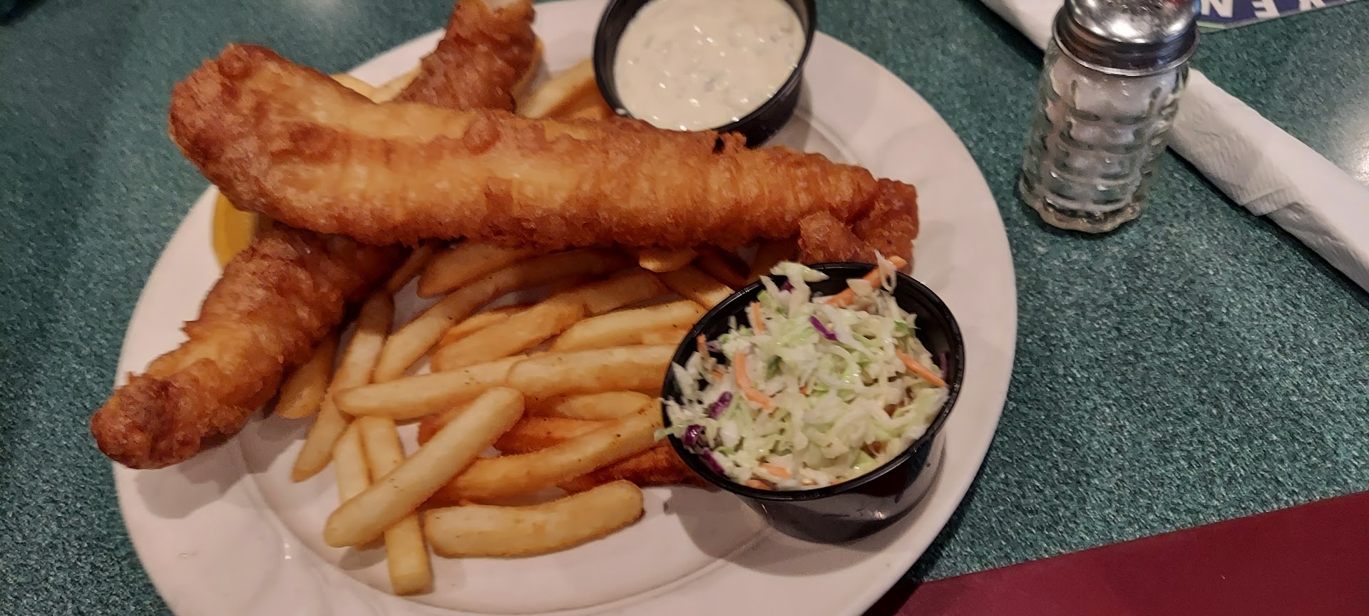 I've eaten here twice in the last three days. On both occasions, I went there for the fish-n-chips. I was so impressed with my first visit that I had to go back. The second visit did not disappoint. Each time, I was served two pieces of fish, approximately 8 or 9 inches long, about 3 inches wide in the middle, tappering down to about 2 inches on each end. At about 3/4 inches thick, the lightly crisp crunch of the golden batter coating and the fluffy white melt in your mouth fish (probably cod) was enjoyably delicious. It was served on top of a plate full of chips (fries), which were good. It was served hot straight out of the fryer. The small side of the coleslaw slaw that came with the meal went undertouched by me.