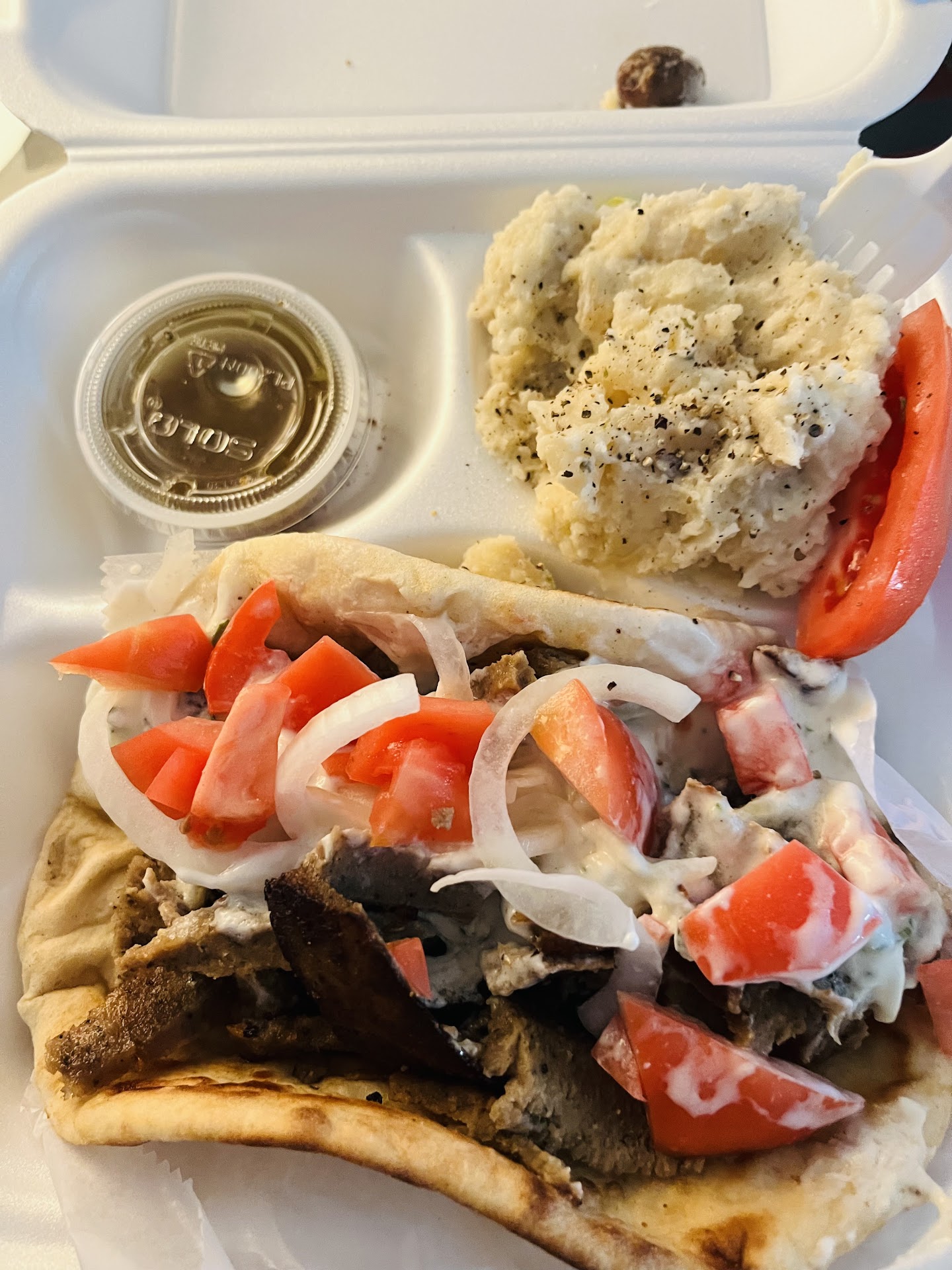 But after discussing, we agreed that we rate a Greek establishment on the gyro. I ordered the lunch Gyro Platter with Greek salad (salad dressing was superb), pita bread, and tzatziki. And my guy ordered the gyro (tomatoes, onions & tzatzaki sauce nestled in toasted pita bread). We agreed that both of the gyro orders deserve the five-star rating. Delicious.