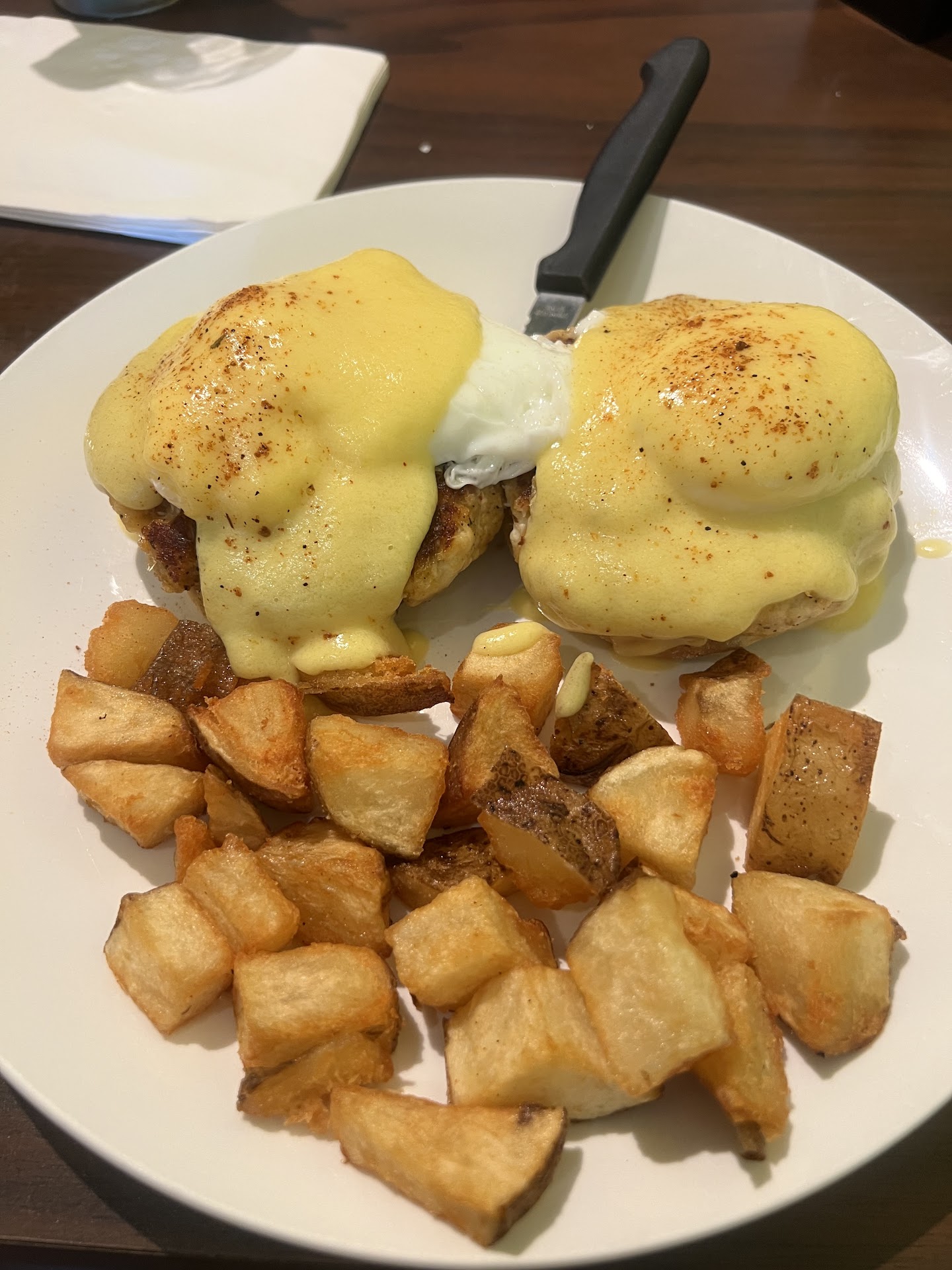 Got the local benedict ( seared crab cake that literally took up the entire english muffin and was at least 1/2 inch thick or more. The eggs cooked to perfection and the hollandaise sauce was lemony n perfect . potatoes perfect crunch . My friend had the fish and chips , said was great