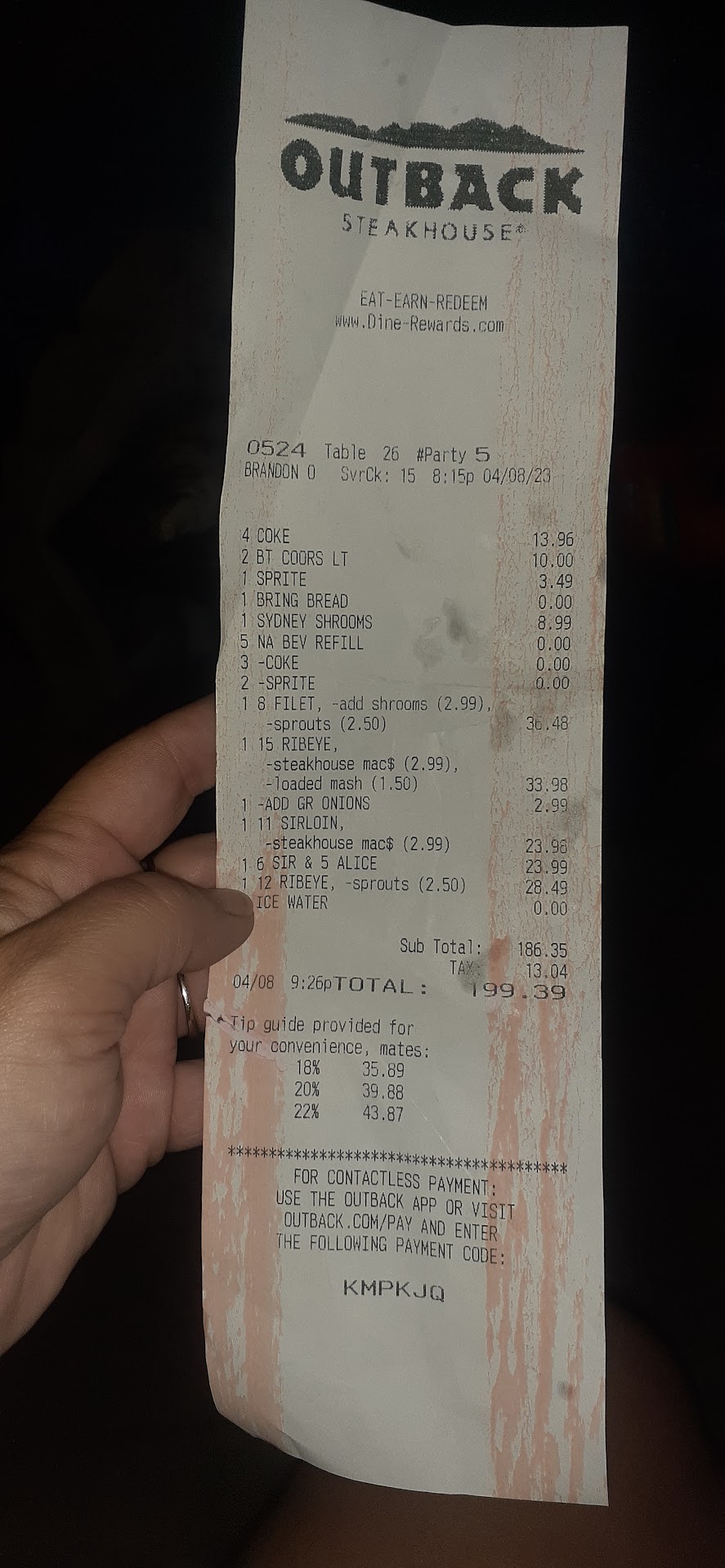 Update 10/21 went back to this outback to give them another try.. Steven wasn't here to oversee everything but it was a decent experience .. I wait to speak to Tony I believe (she didn't seem to really be aware of what happened last time) anyways i waited almost 10 minutes to be seated the hostess up front didn't know I was staying to eat nor did she ask she cleaned a table and smile at me walked past and smile, i tried to get her attention but i just waited.. no big deal just miscommunication. We were seated and our waiter Gabriel was nice and took our order when the food came out my steak was over cooked but right away he took it back and got me a medium rare like I had ordered, the food was delicious the bloomin onion was not drenched this time . All in all a decent time. I can't highly recommend but I can say try it at least once an then decide for yourself..I can say the towomba sauce is DELICIOUS!also the gradituity doesn't match up either because they comped a the steak that had to be remade which made the total higher and at the bottom it gives you a guide an it went based off of the original price before the steak was comped, not upset about it but if I didn't know math I would've been lied to so gross check 110.69 before deduction it said the tip was like 19$ for 18 percent but in reality my bill was 91.20 an the tip would've been less just a heads up before going off the check.( My food to go leaked...