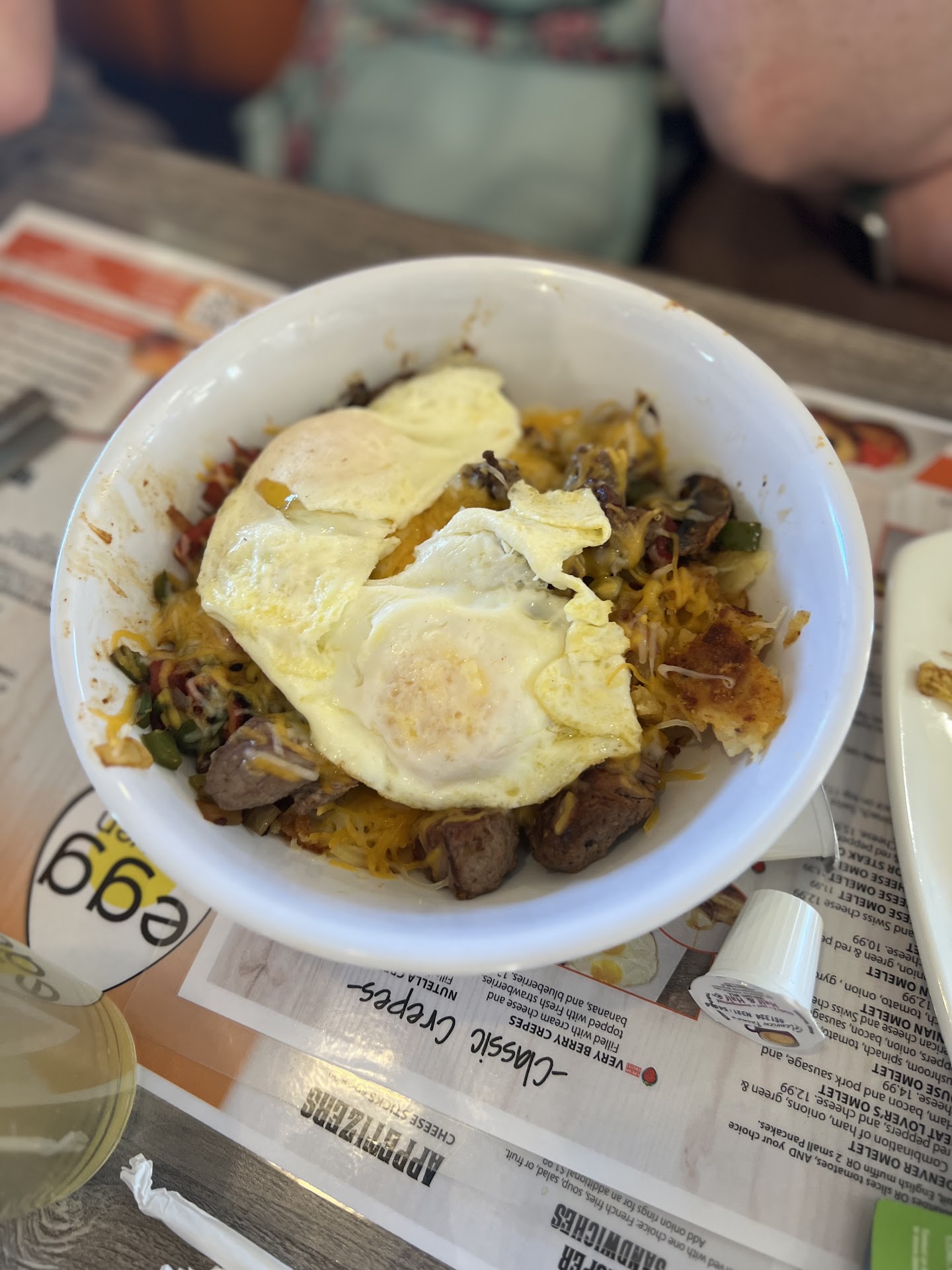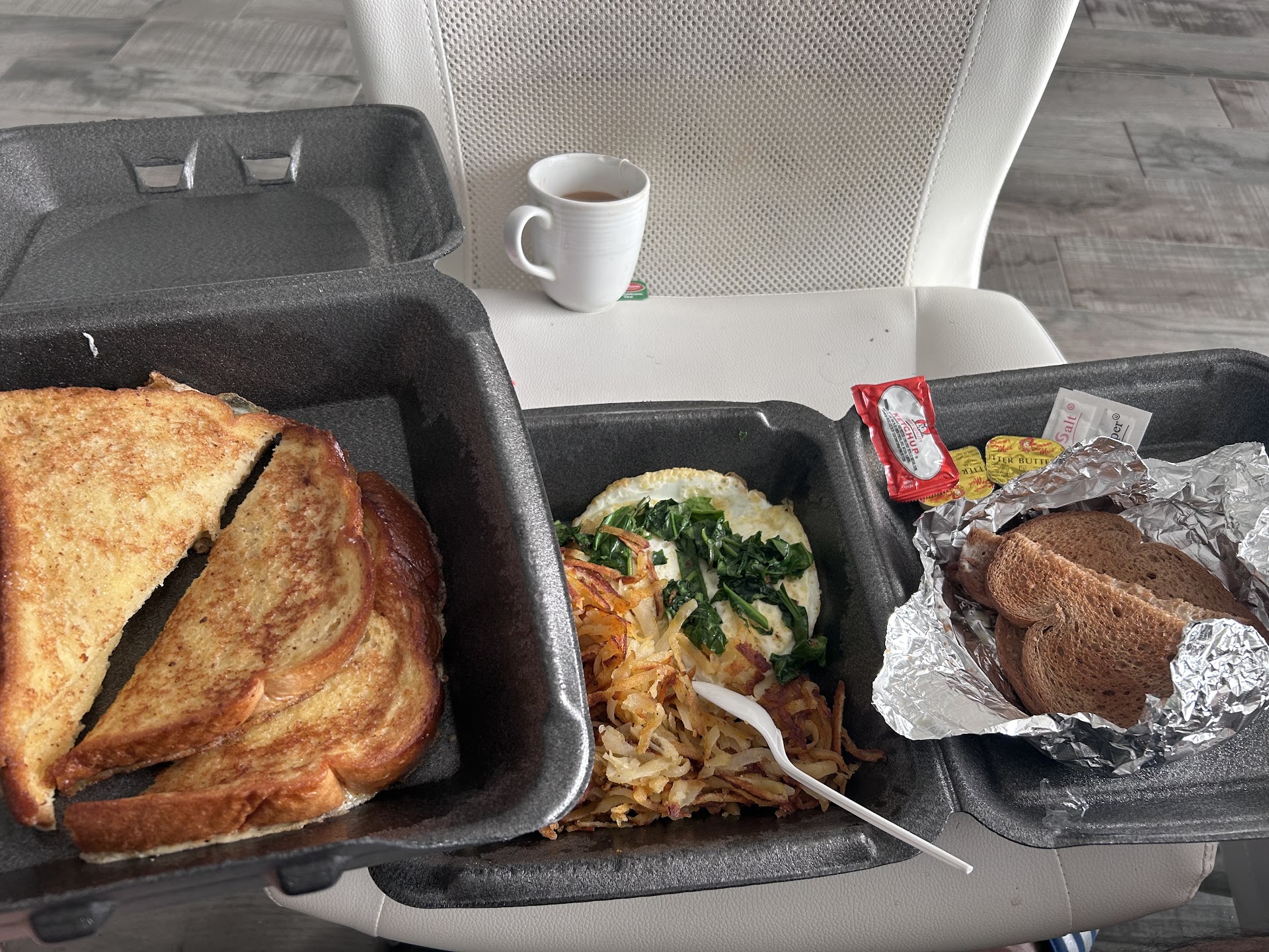 I have adopted a strict dairy free/low sugar/no-processed-food diet focused on protein and fresh veggies with natural/unprocessed carbs. No problem here! Eggs perfectly over medium, a large seasoned hand-formed hamburger patty, fresh sautéed yellow squash and a big baked potato (off the dinner menu)! Breakfast/lunch/dinner was served!
