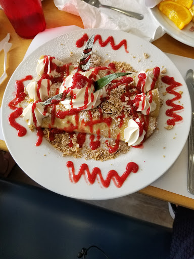 Β Β Β Read moreOh man, I thought that by only ordering a crepe and 2 eggs that I might still be hungry, but no - it's huge! The crepe was really sweet, but not too much, as well as having just the perfect amount of fruit vs english cream. Absolutely delectable. My boyfriend had the southwestern omelet, which he says was pretty good, he felt it was missing a bit of a kick of flavor though. Elsewise he said he really enjoyed it, and the omelette was also served with fresh fruit (which I hadn't noticed until all that was left was the rinds - so it was fresh enough for him to eat right away!). I quite honestly do not have anything bad to say about this place, perhaps other than it was a bit noisy? That's not their fault though, it was just a bit busy. Along with their well-prepared food, the atmosphere was excellent, bright inside, but not so much that you'd need sunglasses, really pretty murals, and there was plenty of seating, but not so packed together it was uncomfortable. Our server Alecs, was also super friendly! Even though we hadn't ordered much she was sure to check on us from time to time, and it seemed like she truly liked her job there. Fully deserves 5 stars! I highly recommend coming here for...