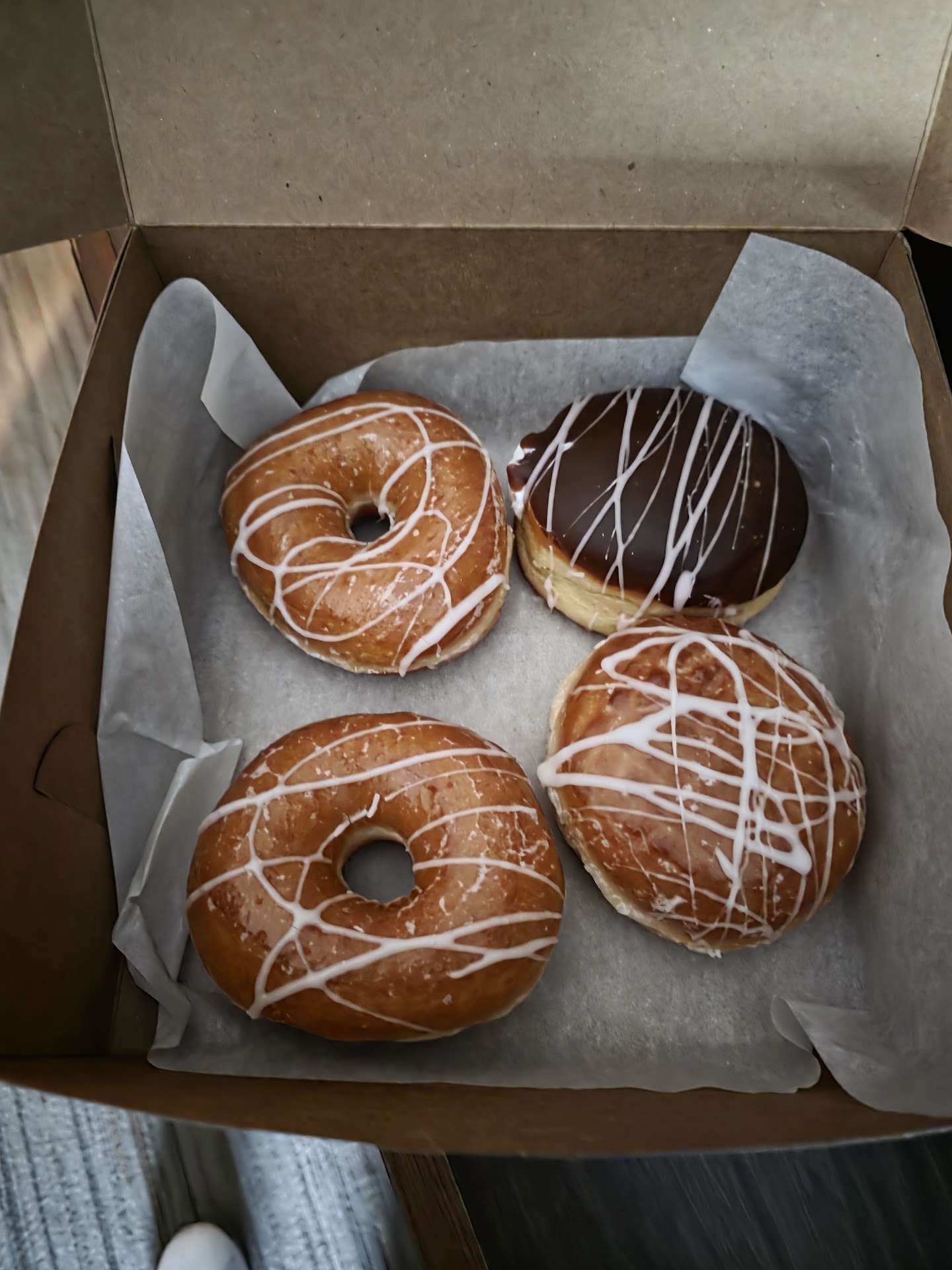 All of the donuts are very tasty. However, I did order some Boston Cream Donuts, which, by the way, are my favorite, but the chocolate frosting on top was hard like chocolate crackle. I took one bite, and the whole chocolate topping shattered and fell off the donut. How bizarre and disappointing to see my beloved Boston Cream donut completely naked and uncovered.