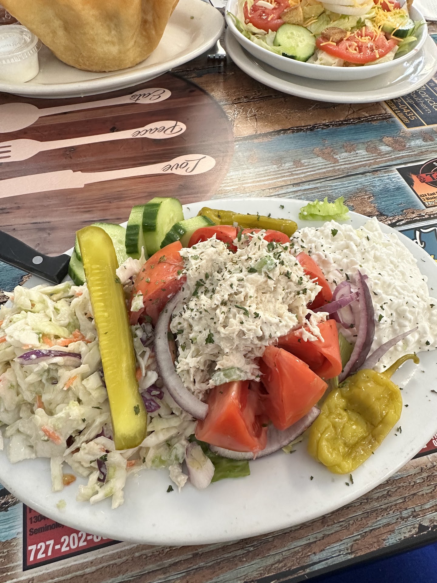 I ordered the chicken salad filled tomato & my husband ordered the taco salad with a side salad as well. The chicken salad was well seasoned, the cole slaw side wasn’t overly sweet or creamy & the tomato it rested in was plump, juicy and perfect.
