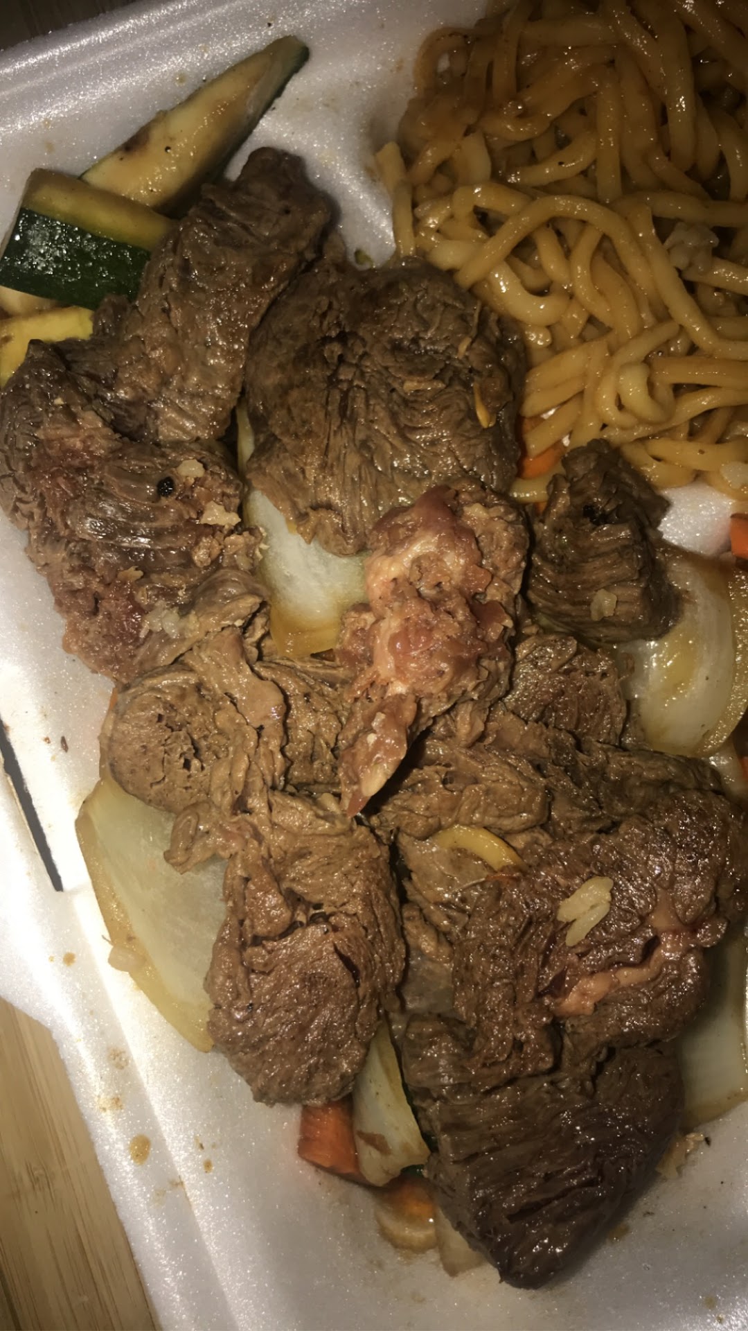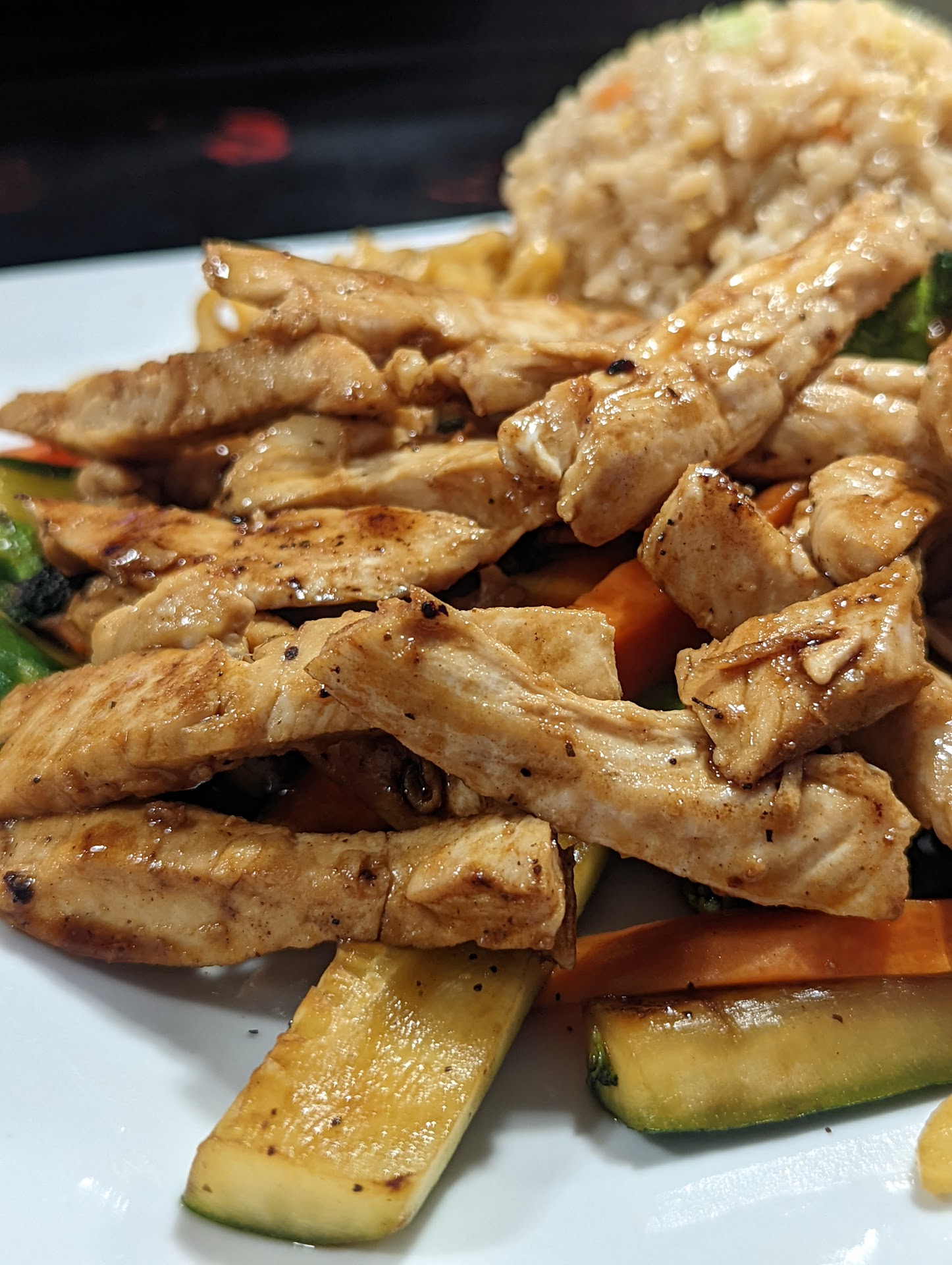 Hibachi Chicken and Veggies with rice and noodles, let us not forget the salad, was my choice. I had them make an Iced Green Tea also. Most places use matcha, I don't think they caught wind of it yet. I had about a 12 minute wait for my hot food but the salad was right out. It was amazing. The ginger dressing on the salad, I found out when the head chef came out of the kitchen, was made in house, not that waterdown stuff. I could hear my main dish finishing up and as the sauteing ceased it came out steaming a moment after. The sauce it was prepared in was so flavorful. The portion was large but I was hungry and enjoyed having a bit extra, I'm a big guy.