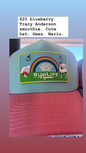 Read moreThe photo of the blueberry smoothie pulled us in. Tracy Anderson approved!!! There was no price on the poster —just an enticing photo of a cosmic mix of blueberry, coconut, pea flower, magical fairy dust and many other unfamiliar ingredients. We ordered without concern—then noticed the $20 price tag. We were in a good mood and waived the sticker shock, feeling the promise of a perfect Tracy A body and that Larkspur Luxe vibe. As we waited, and we waited too long for a smoothie, we were the only customers, we noticed how grumpy and frumpy both the staff and the shop were. Dirty, cluttered, aged yellow film over photos of the food, boxes everywhere, unhappy staff. It took about 15 minutes for the $20 smoothie. It had the odd putting taste of stevia or a weird fake sweetener. I don’t recommend this place. Cute hat tho. I’d rather have spent $6 more...