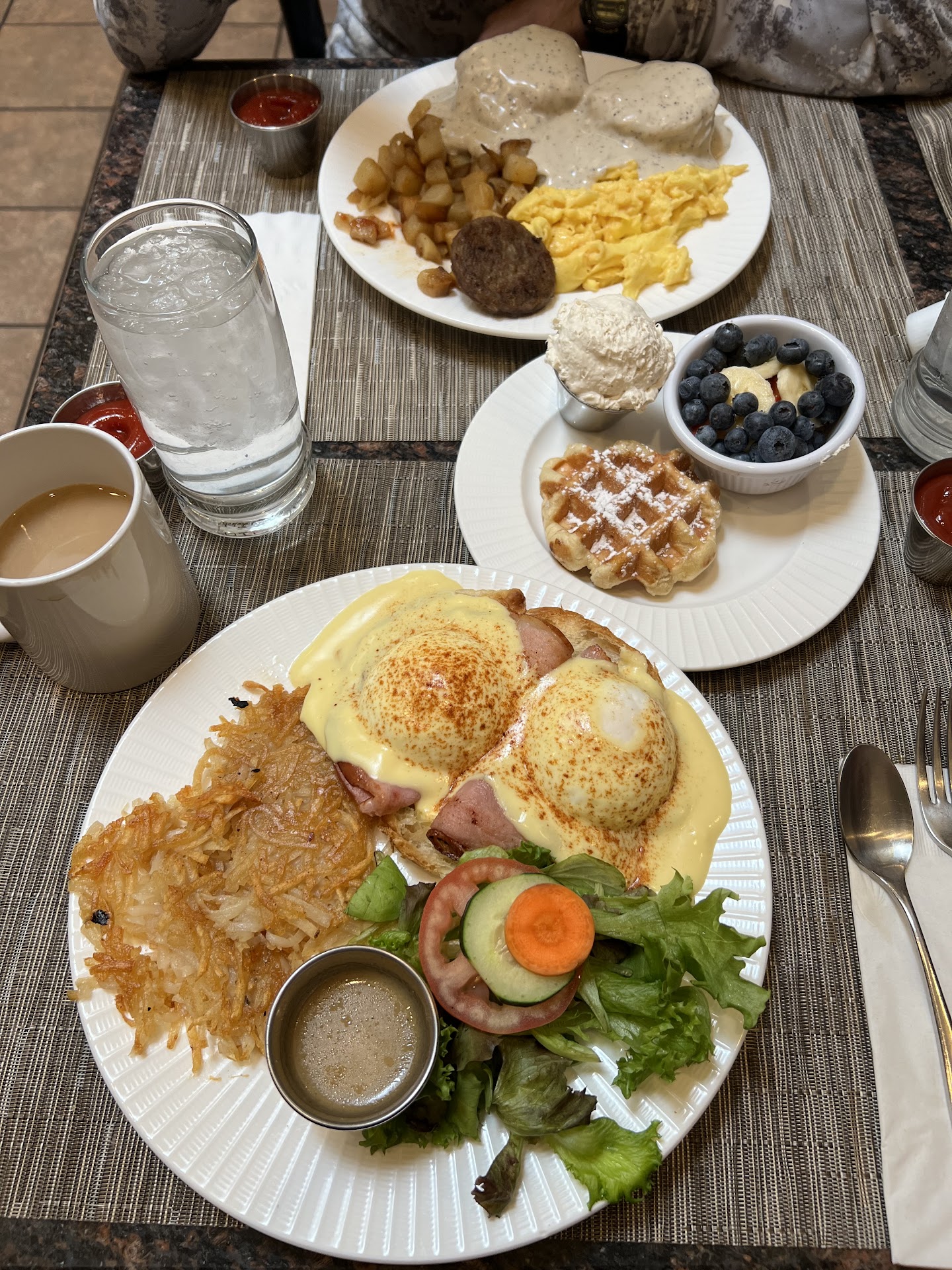 Read moreWe were passing through town, stayed at a local hotel and woke up looking for a place to have breakfast. We searched up “breakfast restaurants” in the area with 4 or more stars. Google maps had this place at a 4.6, so we thought we would give it a try. When we drove up we found parking a little cramped. Driving one vehicle and a truck pulling a Uhaul trailer - we parked down the road and walked. Entering the restaurant the young lady that greeted us sounded like she wasn’t happy to see us at all “how many?” and gave us a wait time that sounded like she hoped we would reconsider and go somewhere else, but we said “it’s fine, no problem, we’ll wait” she came back a few short minutes later with attitude and sat us. She sat us right behind the wall next to the restrooms at the bar. It was cramped and seemed strange that the place would be so small since we had to walk all the way around the building to get in. My husband said he thought there was a larger dining area on the other side because he could hear voices coming from that end. I got up and went down to the other end and sure enough there was a main dining area there. I went back and joined my family at our table and waited. Our server was very nice. The food took a little while to come out, but it looked very fresh. I ordered the Eggs Benedict, one waffle with vanilla cream cheese and fresh fruit. My son ordered the biscuits and gravy plate. My husband ordered a breakfast plate. We tried a little of everything brought to our table. Here’s what we really enjoyed: the eggs (cooked to perfection), the hollandaise sauce (so rich and creamy), the bacon (perfect thickness and meat on each strip), sausage (great seasoning and tender), the waffle cream (a light vanilla with smooth and buttery cream cheese), fresh fruit (no spoiled or squishy pieces), the biscuits - without the gravy (the biscuit was buttery, soft and had great flavor) and the waffle (the breading was dense but soft and had great flavor) Here’s what we didn’t like: that the hash browns were greasy, the gravy (it was very bland and black pepper content was through the roof and made it too intense to eat), the giant sugar crystals in the waffles, the seating and the attitude from the hostess. Other than that it was an overall good experience. I would definitely go back. I would just ask to be seated in the main area and order things a little differently. Thank you to our server for making us feel so welcome and for taking such...