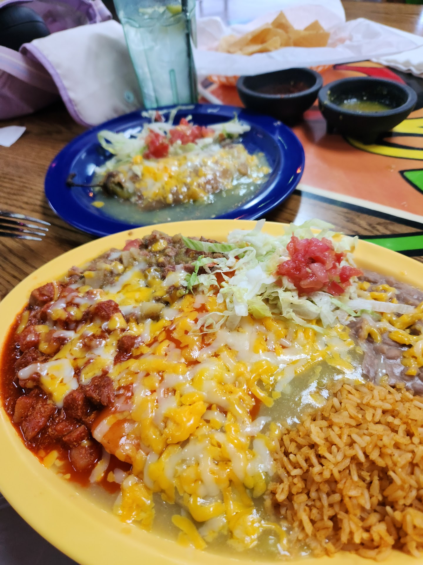 Fajita taco salad Fish tacos Kids cheese enchilada Complimentary chips and salsa (salsa kicked on this day) not sure if everyday. Fried ice cream