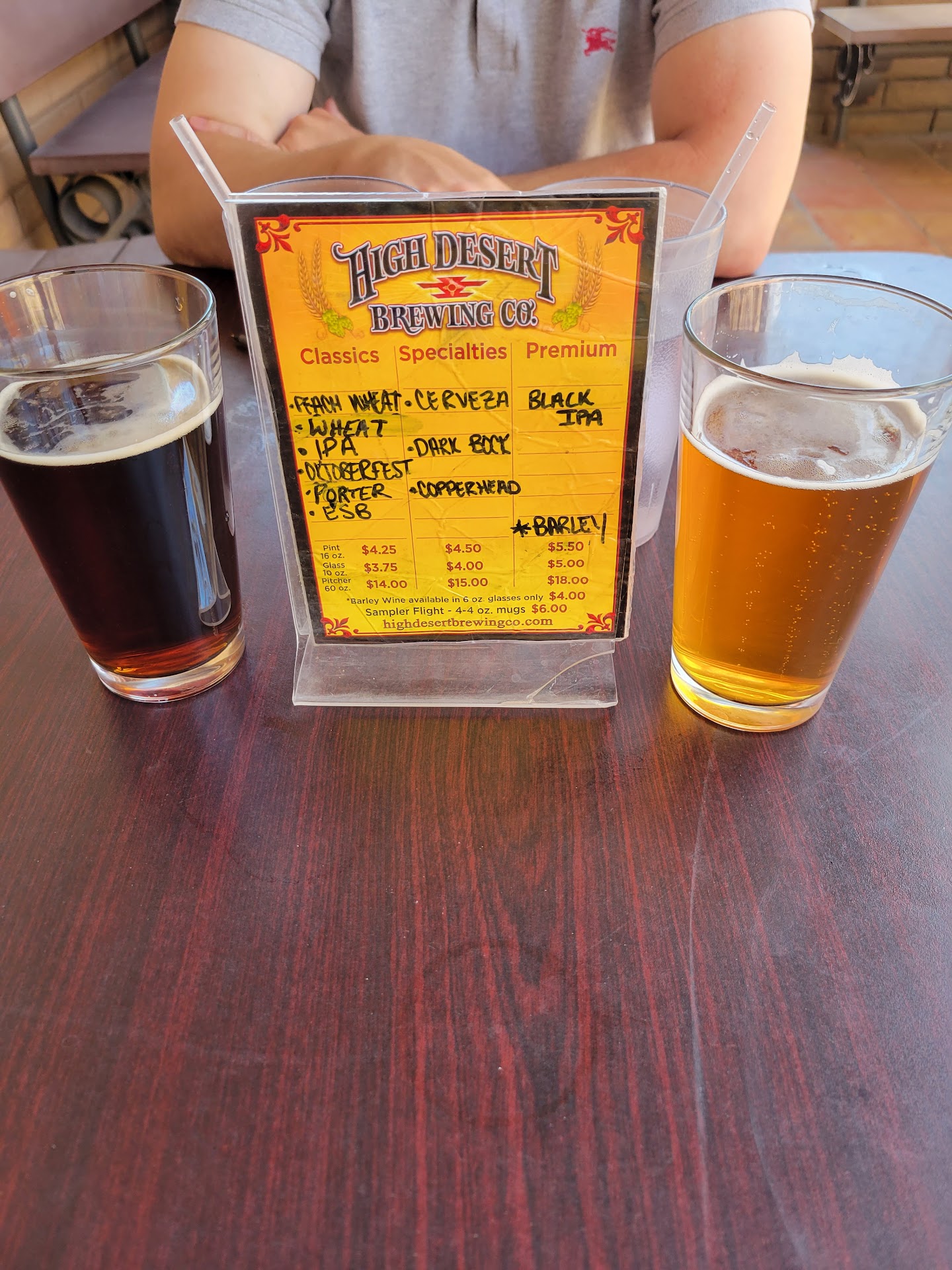 Read moreI have been coming to this place for over 10 years to this day. It is in my opinion, high desert brewery is the absolute best microbrewery in the state, maybe even the world! Food is great with variety to chose to choose from, and priced fairly. Beer varieties are usually kept to decent sized batches being brewed at a time, whiches gives you a decent amount of options. Not as many as I thought there would be. However each style that's brewed has not disappointed me' and each style has its own distinctn1ess in taste aroma, body, sweet, and lovely bitterness! Trust me you wont be disappointed either. Staff is friendly, easy on the eyes and very professional. The inside was clean, and beer was plentiful!Outdoor dining may already be allowed. As it seems to be, everytime I go to pick up my usual growlers to take home, which are priced very well in my opinion usually starting at around $11-$12 and on upwards, pints usually uunder $5. Dog friendly environment. Overall, Great...