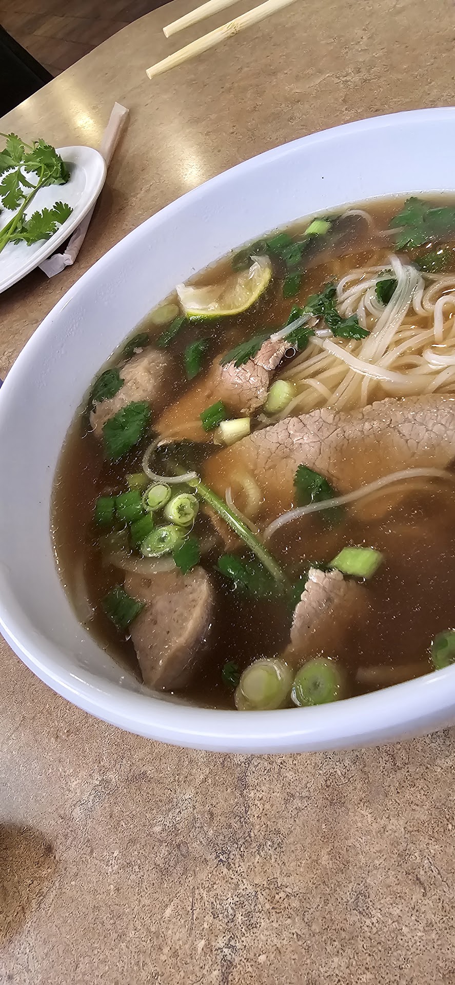 Read moreHad the Pho Combo (beef, brisket and meatball) and my daughter had the chicken Chow Fun. The pho was served in a large bowl, warm and steamy. After mixing in a little of provided cilantro, jalepeno and lime, it was a pleasant taste and flavorful. The noodles underneath were soft and delicious. The meat had good flavor, satisfactory texture, and plentiful amount. My daughter did not like the Chow Fun much, she said the noodles were too chewy, but liked the chicken pieces. We both tried their fruit smoothies and they were very good and hit the spot. The restaurant seemed to be clean but the decor is dated or non existance. Staff was ok, but quiet. Would come again, they have a few more other entrées to try...