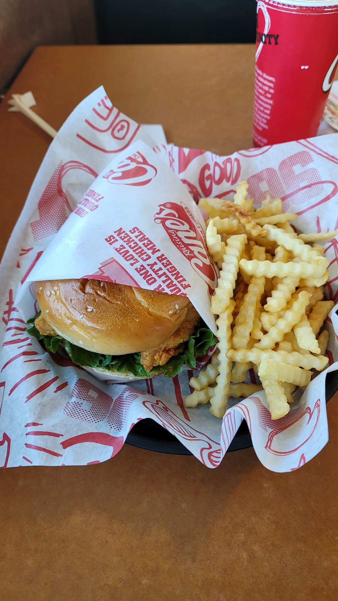 Read moreThe chicken fingers and French fries are always hot and crispy. The chicken fingers, especially the breading is rather bland and tastes like flour that needs to be seasoned but they're still good. The chicken fingers only come in white meat which is the breast. Their Cane's sauce isn't good at all in my opinion. Honey mustard or even Ketchup would taste a lot better than their Cane's sauce. The coleslaw is very good. Their coleslaw tastes fresh. There aren't really any selections on the menu other than the sizes of the chicken fingers or maybe a chicken sandwich combo meal made from three chicken fingers. The lemonade is cold and refreshing and it tastes fresh and like it is homemade. The prices are a bit high in my opinion considering it's $8.00 for a four piece meal, although I do enjoy eating the chicken fingers, fries and coleslaw and drinking a cold lemonade occasionally. I'll continue coming here. I've had errors in my orders and even I've called them, they've taken down my name and replaced my order on my next visit...