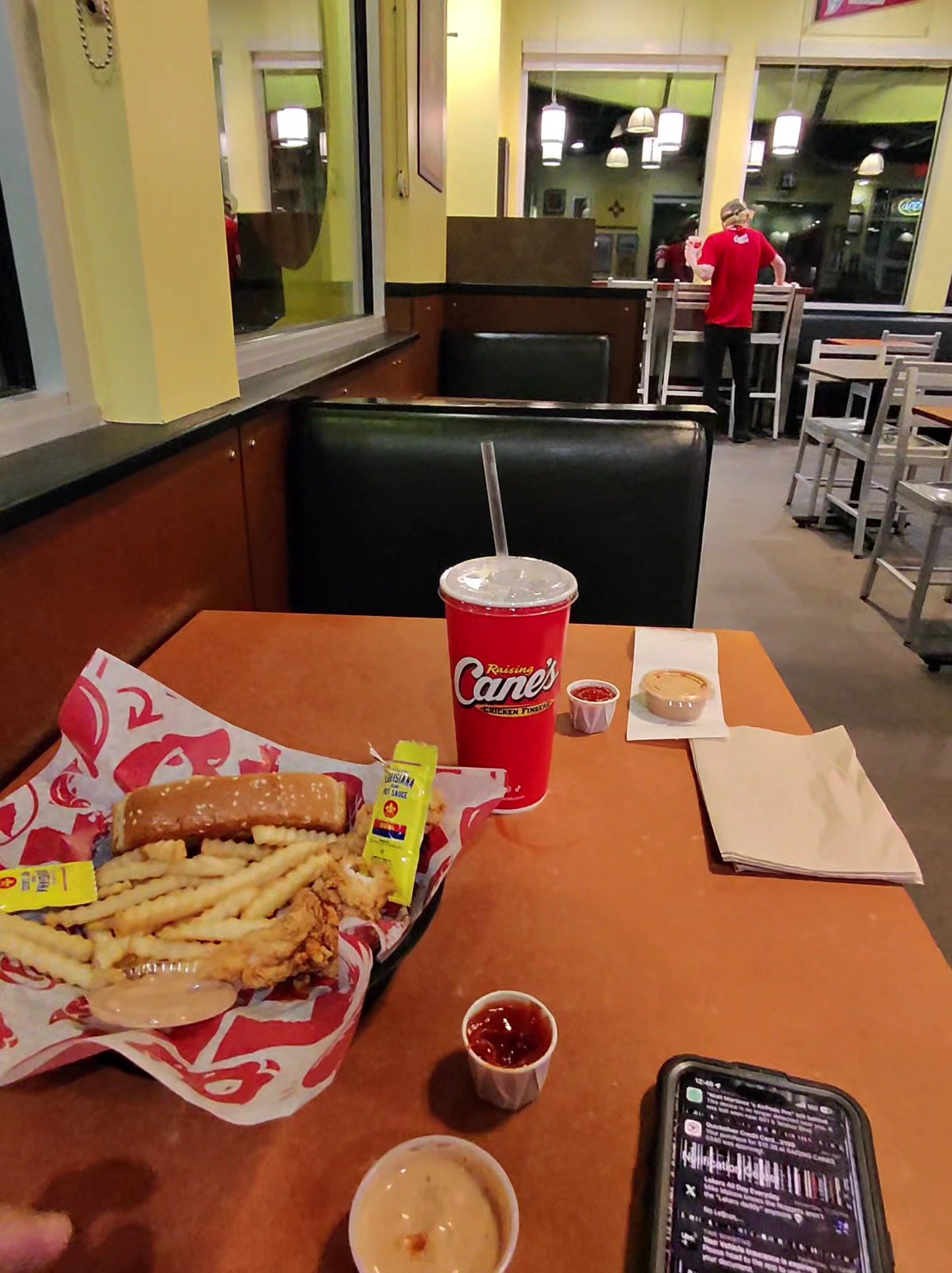 Read moreI love this place. I would be more then happy to change my review rating, but my most recent experience left me disappointed, I work graveyards so when I saw they were open till 2 on my way into work I pulled in, I was told there would be a full wait and that was fine with me I had time to get to work. Then they said nevermind the full wait here you go. They handed me the meal I drove off and when I got to work my caniac combo was 4 of the smallest chicken fingers I had ever gotten from canes so not only was I shorted 2 fingers it's like I got the rejects. Add that the fries were old and stale and I get to start my work night frustrated and hungry 🙃....