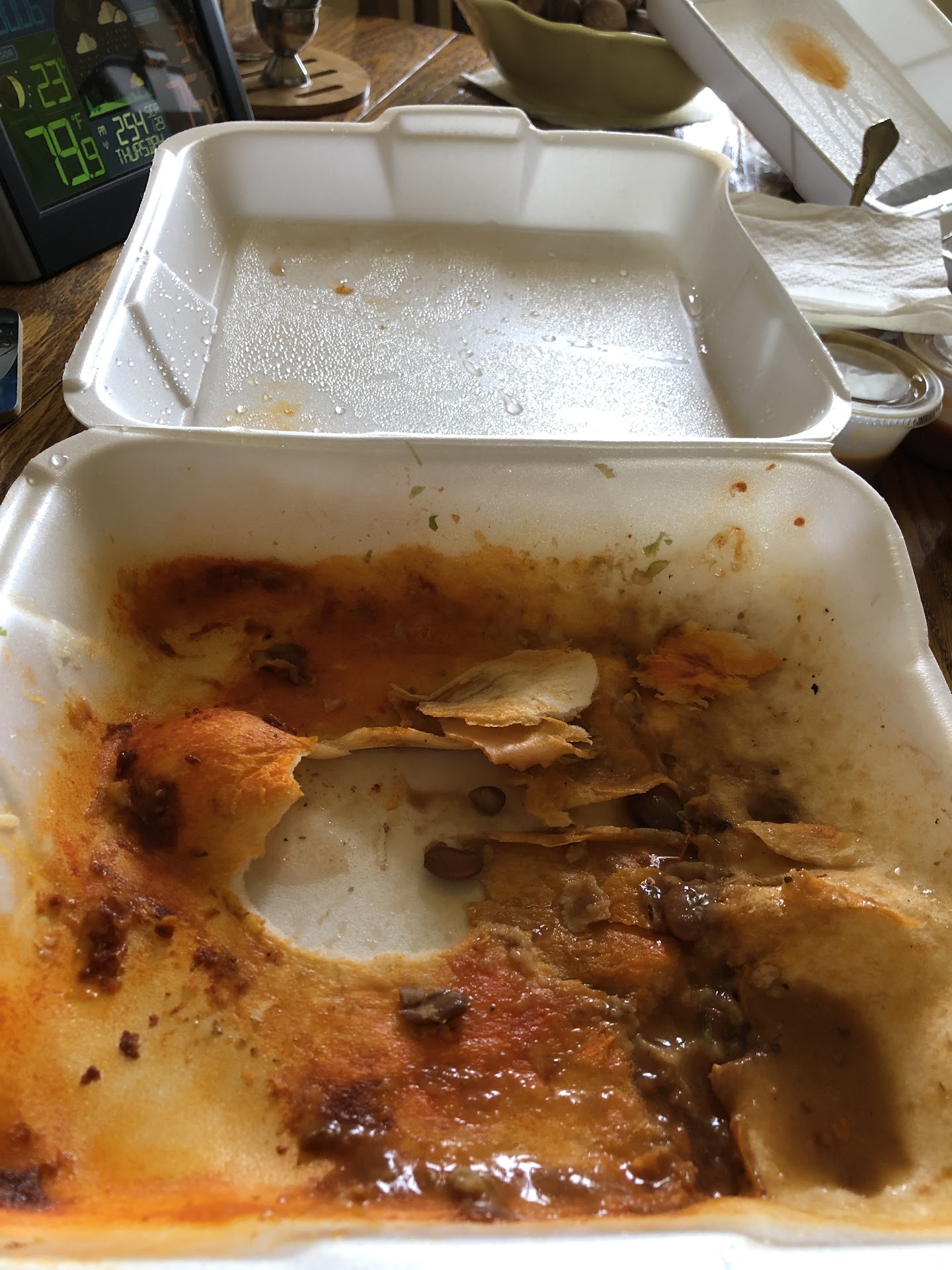 What a disappointment with a place that normally is a favorite of mine. Look at the blistery holey, stained melted styrofoam container....