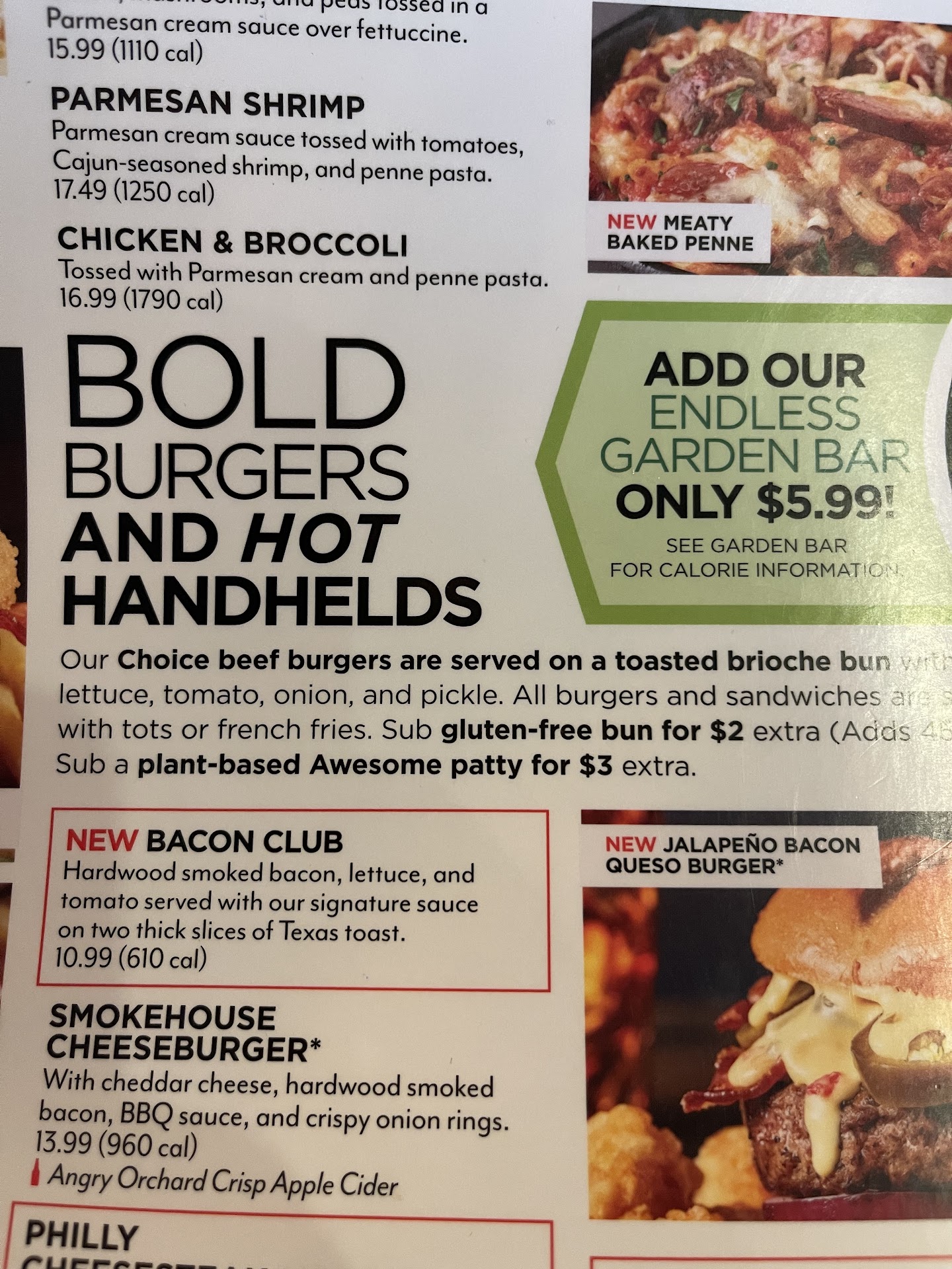 When I finished my salad and soup, I tasted the “Parmesan cream sauce” covering the chicken dish. It was bland and tasteless. I scraped it off. I am presuming Asiago cheese flakes were in the dish, but they were not visible. The dish did not look like the menu photo. The chicken was not two chicken breasts as described, but two chicken breast slices. I tasted the chicken. It was moist and tasted fine. I took a piece of bacon, but was not impressed and did not finish it. I tasted the broccoli. They were very overcooked and were mushy. The mashed potatoes were tasteless and unseasoned. I decided the only thing I was taking home were the two chicken breast slices for my dog.