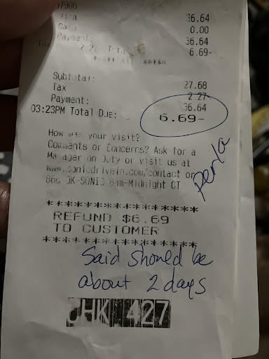 Read moreWe had a coupon that wasn’t working properly so the manager came out and said she would manually discount it. Once we got our receipt, the discount wasn’t on there, so we called her again and she said she would just give us a full refund. She printed out a receipt that looked like it had a refund for the milkshake and she said it would return to our account in 2 days. After 10 days, it still wasn’t there. Honestly, now that I look at it again, the receipt looks like she attempted to refund it in cash, but she never brought us cash, and since we paid with card she said it would be returned to our account, which makes sense. so we tried to call the number on the receipt as well as the number on their website (which was the same number) and it constantly said the number was disconnected. We tried about 5x over a 2 day period. How can a restaurants number be disconnected? We called the number on sonics website for customer service and they told us that if we didn’t order through the app they couldn’t help us, but they would let upper management know and they could get ahold of management at the restaurant and they would have them call us. 5 days later and we still haven’t received a call from this locations management. We were only visiting Las Cruces (looking to move there) but we live in California so we can’t even drive back to the restaurant to demand our refund! What a SCAM! We still intend to move there next month, but I surely won’t be visiting this one again unless somehow, miraculously, they get ahold of us...