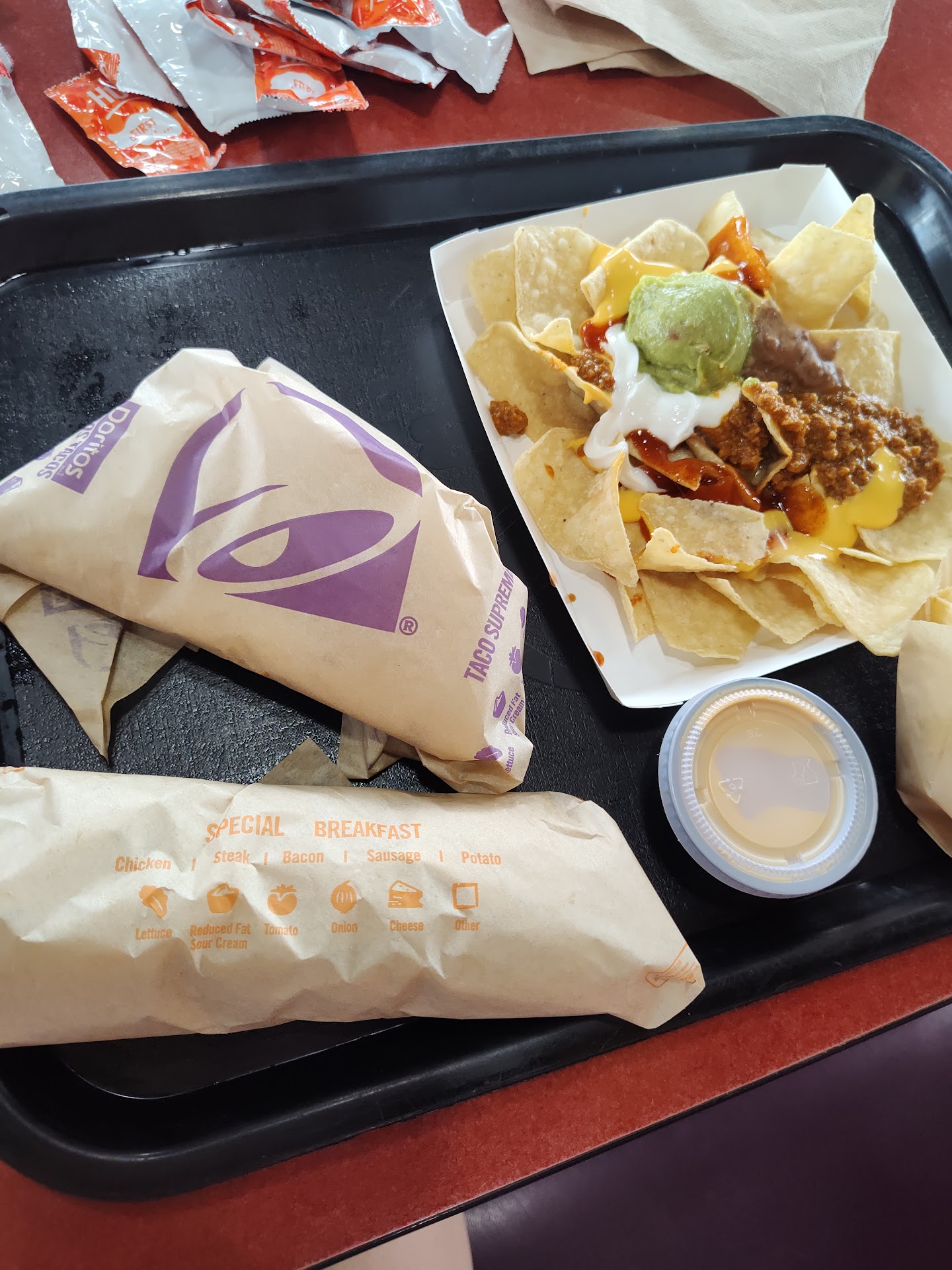 This is my Taco Bell I regularly frequent because it is very convenient for me. I have been eating at Taco Bell's ever since the Beefy Toastada was served. Bet no one remembers that ancient artifact 😁. I have read some of the reviews and I can honestly say this particular Taco Bell is making a herculean effort to improve as there were several undesirables intentionally trying to hurt the business (my opinion of course but who wants panhandlers sitting next to the entrances). Really a nice place and the kid's (employees) are trying hard, and succeeding. COVID really took a toll. The employee turnover rate was remarkable in the way management handled it. The vegetarian menu is a great addition, the bathrooms are clean and are "policed" regularly. (See panhandlers above). The dinning area is comfortable and even has bar stool seating as well as comfortable booths. Modern music is playing on the loudspeakers as there is a middle school right up the road. Go...