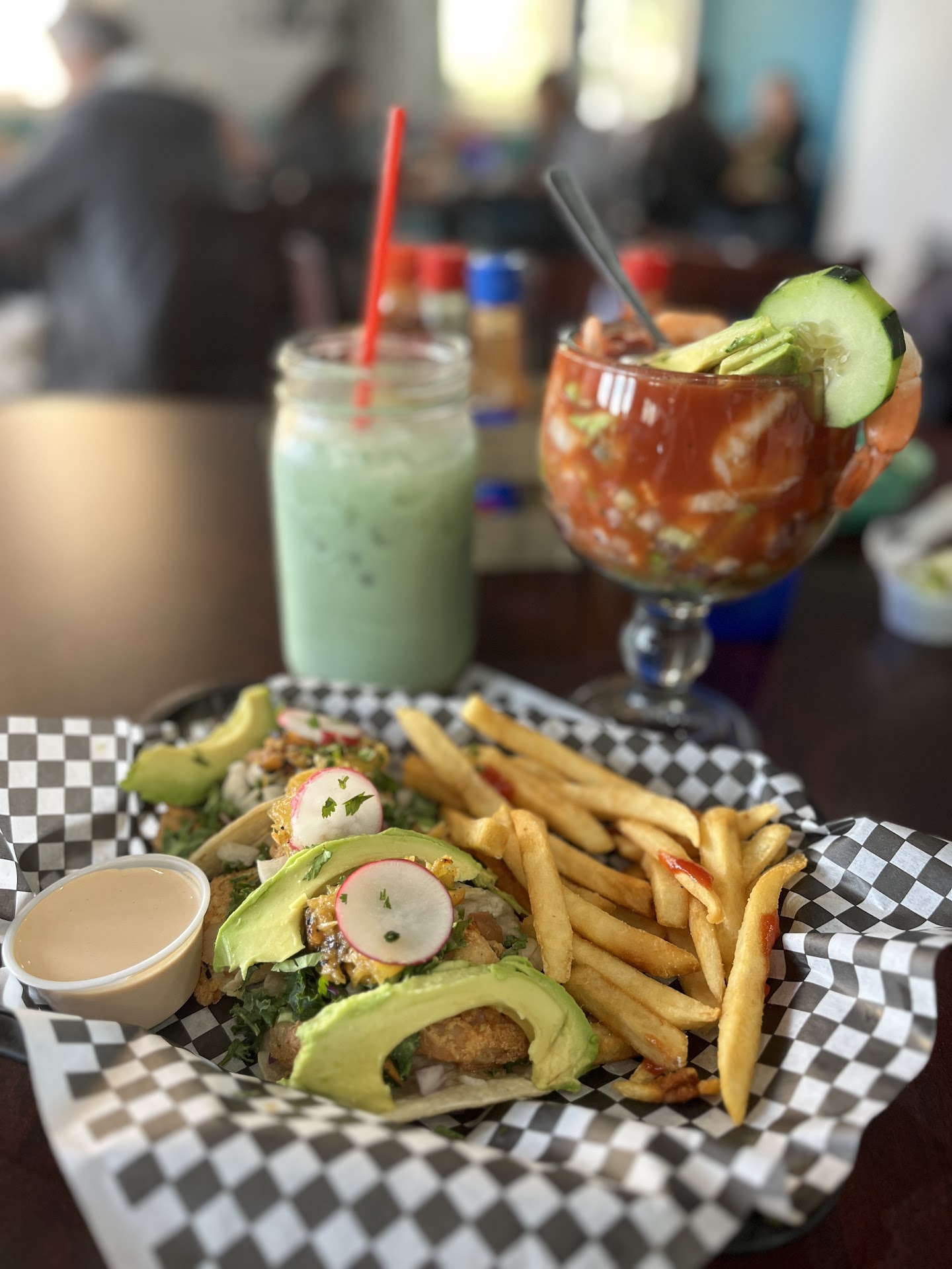 Read moreI have Celiac disease and kept hearing this place advertised on local radio. I love Fish n Chips and thought this would be a great place to try. Went there for my Birthday. Not a good experience. First, it took about 30 mins to get our Take Out order handed to me. The order I'd placed no less than 45 mins prior. Then the person at the cash register rung it up (expensive, so better be good! Ah well, it's my Birthday). The "fish"? It was like a bootstring with batter. Yes, it was that thin. Only ONE of those too on each taco. If it hadn't been battered I'm not sure I'd be able to tell it apart from the shredded cabbage. We'd also ordered a couple appetizers. Would have been left hungry if it wasn't for the filler sides and app. Additionally, when I paid for the food (before it even came out of the back... then waited another 20 mins) I left only a small tip because A) it was already ridiculously expensive B) I had no idea if the food was any good C) I was only picking up the food, not being served and it took 10 mins to be acknowledged anyway. So, when I saw the person (who'd rung up my order and handed me a receipt) she gave me serious stink-eye. So entitled! I'm a good tipper when I go into a place, eat and receive prompt, friendly (that wasn't a thing with this person either) service. Your tip reflects the service! Also, the fish tacos were not just bad, they...