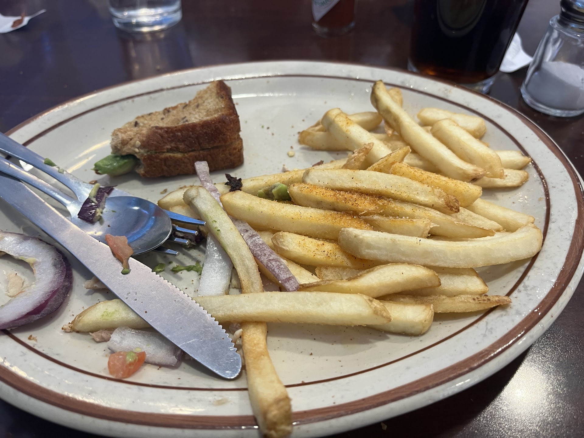 I loved the early 1970s retro mod decor: the blue and brown decor, the font with the letters bouncing above and below the baseline hearkening back to a more optimistic time. Due to proximity to the interstate, many customers are in transition to somewhere else, like me.