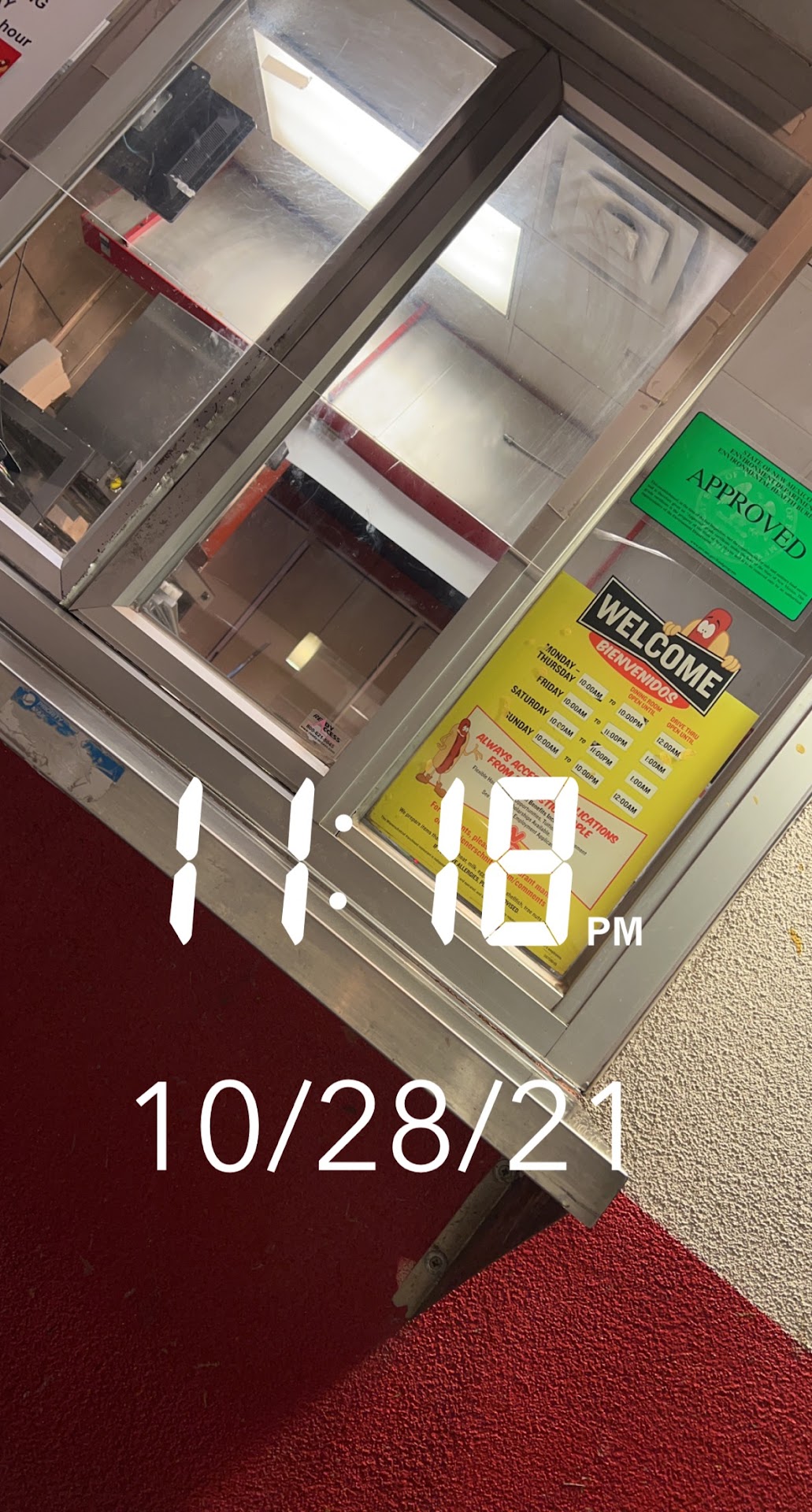 On October 28, 2021 my girlfriend and I decided to go to a wienerschnitzel located on 2800 N. Main Street. Las Cruces, New Mexico to get some late night food around 11:15 pm. According to Google and to the times posted on the drive thru window (not to mention the drive thru open sign) the location was still open and serving customers.