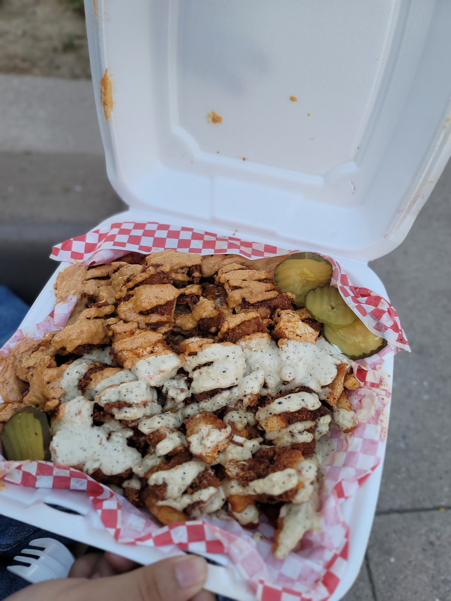 I ventured boldly and ordered 'The Rhino'—an off-menu behemoth that married Crackin' Fried Chicken Fries with a Green Chili Burrito and crowned it with their famed Philly cheesesteak. This dish was not for the faint-hearted, nor was it for the casual diner. It was a colossus of flavor, towering over the mere mortals of regular food truck fare.