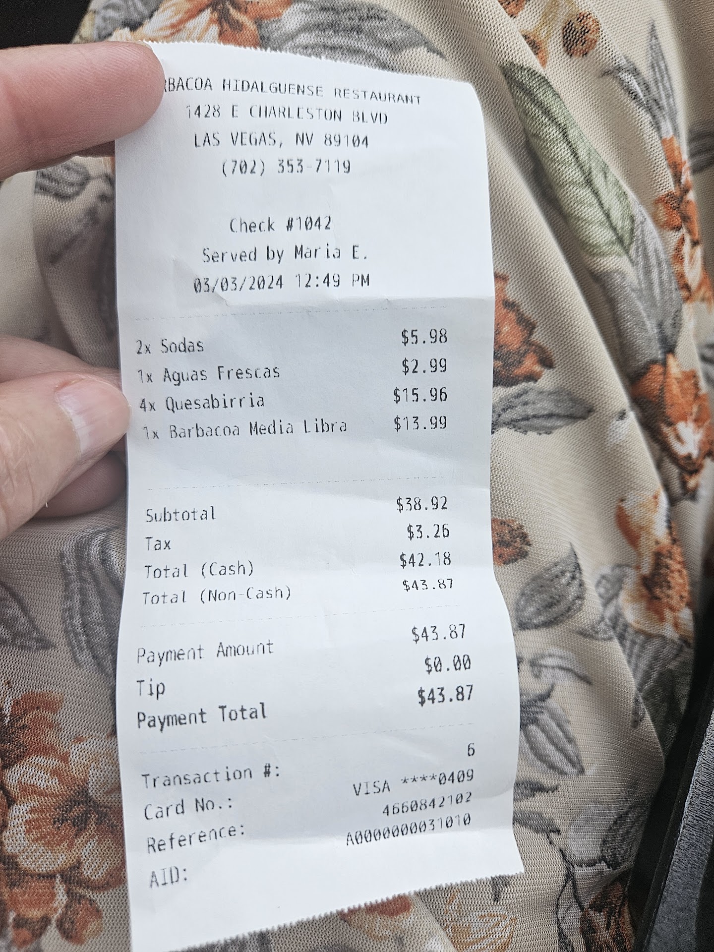 Read moreIt says Barbacoa, so you would think to walk in order some barbacoa and eat. But NO I order a plate and was told they didn’t had any to serve, I order a second menu item and they didn’t had it again to serve (really frustrating) I ended up ordering a gordita, I’m sure they can do way better, and having there waitress trying to figure out where you’re coming from 😒 and telling you how the city of Vegas has been getting crazy with traffic and other news. Don’t get me wrong I know that’s part of her job to be polite but when you’re traveling 6 hours to get here the last thing you want to hear is how bad the city has been getting. You guys should really have a note saying that you only sell barbacoa on...