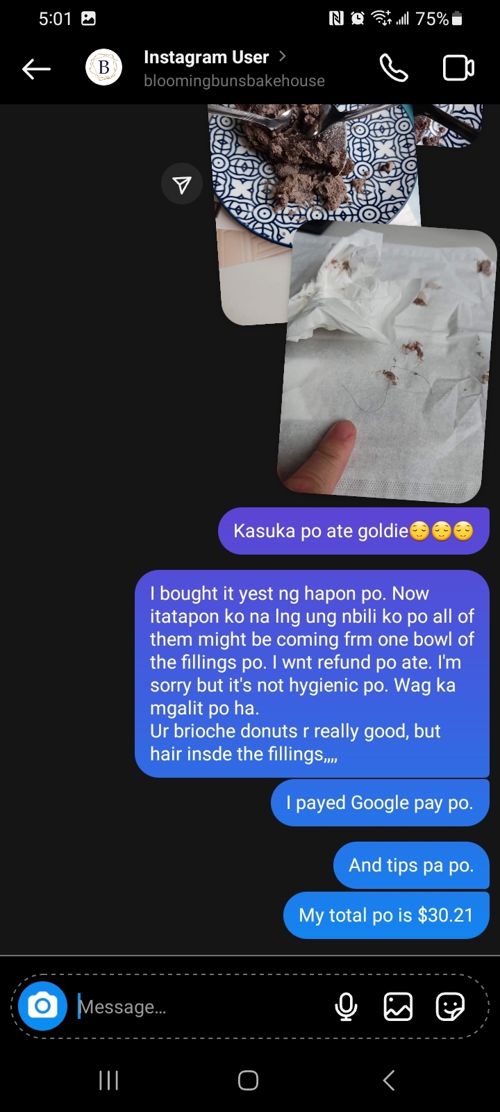 Below are the pics I sent to their Instagram, as soon as she read it she put me on vanish mode. The first time I told you I never ask for a refund! I just told you there's not enough filling q your donuts , that was years ago. And this time , I asked for a refund because it is a $30plus worth of wasted donuts with hair insde. Pls dnt say sorry here where people can see and read. Do it in ur Instagram page, so it will feel like sincere. I don't care not coming there,there are many shops to choose from. Positive or negative comments, you shld be able to handle it not only positive. Blooming buns is not a lost, theres always purple potato bakery, who treats their customers right and with respect. Thank you for your so angry response.