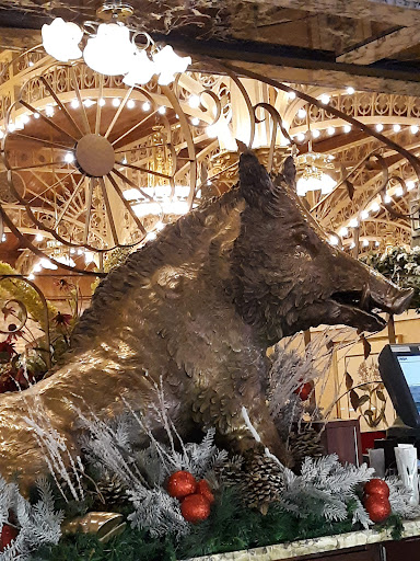 Ornate, Victorian-style casino bar with a brass boar statue offering beer, cocktails & video poker.