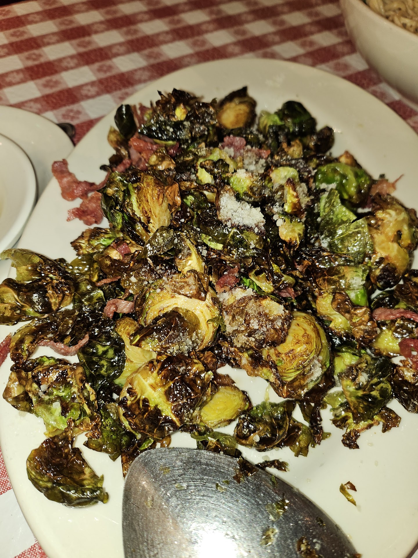 We (two of us) had the house bread, brussel sprouts and chicken carbonara. The house bread was ok, but would have been better if warm. The chicken carbonara was fine, but had very minimal chicken. The brussel sprouts were very dry and not as flavorful as we're used too (I asked for some balsamic glaze and told no, but offered vinegar).