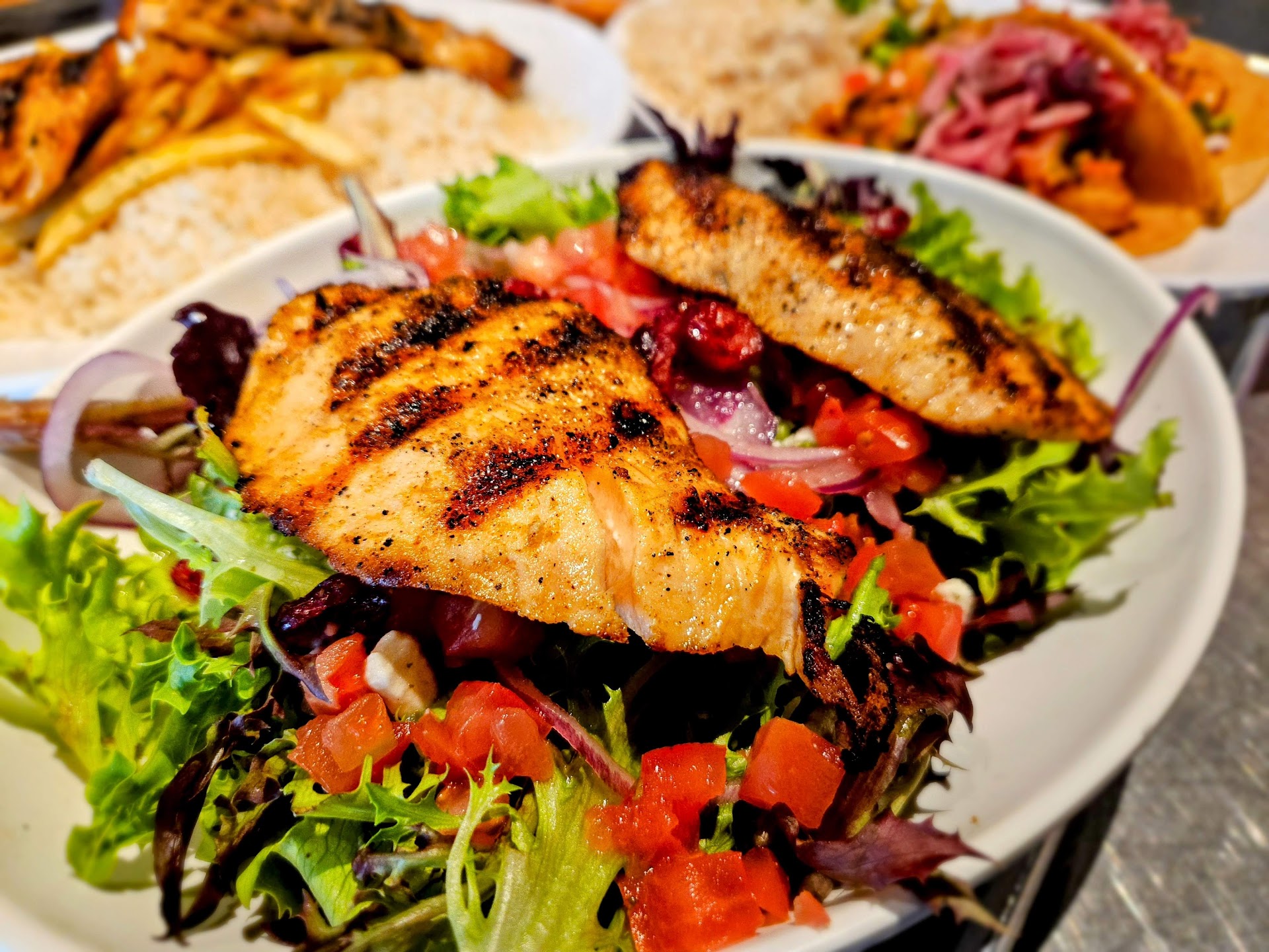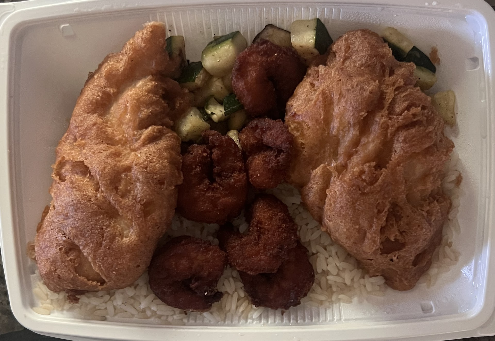 Undercooked Rice- Did Not Finish , Under Battered fish - Completed with an Assist From Packaged Tabasco Sauce Soggy fries - Completed but Very poor choice of placement and they were used as a heat source to keep the Fish Warm Under Flavored "Street Style " Corn - Honestly A Mockery of Eloté DO NOT ORDER Overcooked Kalimari -Did Not Finish The Texture was Far to tough