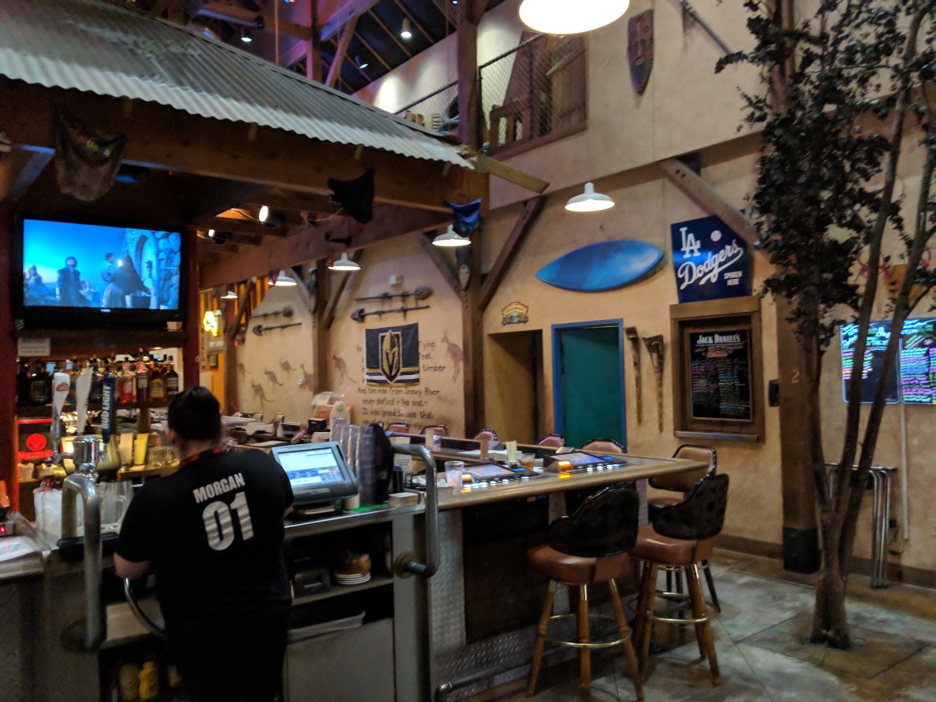The atmosphere and setting of the interior of the restaurant was not bad per say but very dark for some reason. It feels like I walked into a haunted house for a moment! Kidding of course, but I do wish there was a bit more light on the subject. The chairs and furniture was old and a bit creaky and they will probably need to remodel the place very soon, but it seemed very clean and tidy in there. No trash on the floor. There is a bar in the middle and game machines on the bar table! For playing Keno and what not, TVs were playing sports... Just your average run-of-the-mill bar and grill in Vegas! I would recommend...