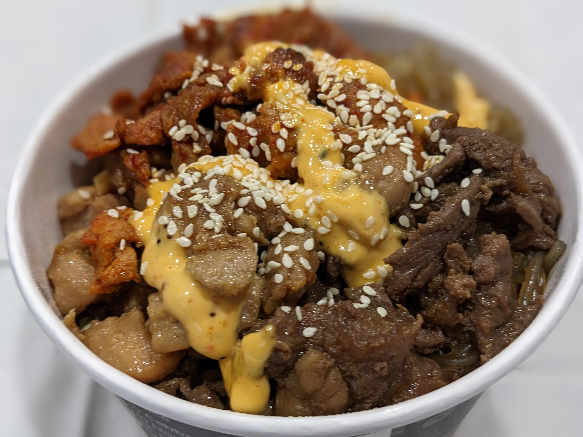 When I walked in, I was greeted very nicely by the gentlemen at the front; it was during non-peak hours, therefore, the restaurant wasn't busy at all (in fact I was the only customer in the restaurant at that time). I took some time to look over the menu since I wasn't a resident expert at this restaurant. But after several minutes of deciding, I opted for the BBQ Beef and BBQ Chicken Combo Bop Bowl with Mandoo and a side of extra Noodles (so I could taste it separately without having it mixed with all the other ingredients/condiments). Since I got my food to-go, I was shocked when I got home to see that the food was still in perfect condition and that the quality of the food was not compromised by the commute. This allowed me to experience the food as if I was dining in, which I enjoyed. For the most part, the food tasted great; I'd say the meats (proteins) were probably my favorite of all the ingredients. The Noodles were good but not spectacular...the texture didn't seem the same as the Japchae you'd get at a Korean BBQ restaurant. I still finished it because it wasn't awful and I hate wasting food. The Mandoo was flavorful, but I was hoping they'd have a less-dense dipping sauce for it - it's the same teriyaki glaze they use for the bowls. It isn't bad by any means but I enjoy the more vinegar-centric (thinner base) sauces - still a must to have with your bowls.