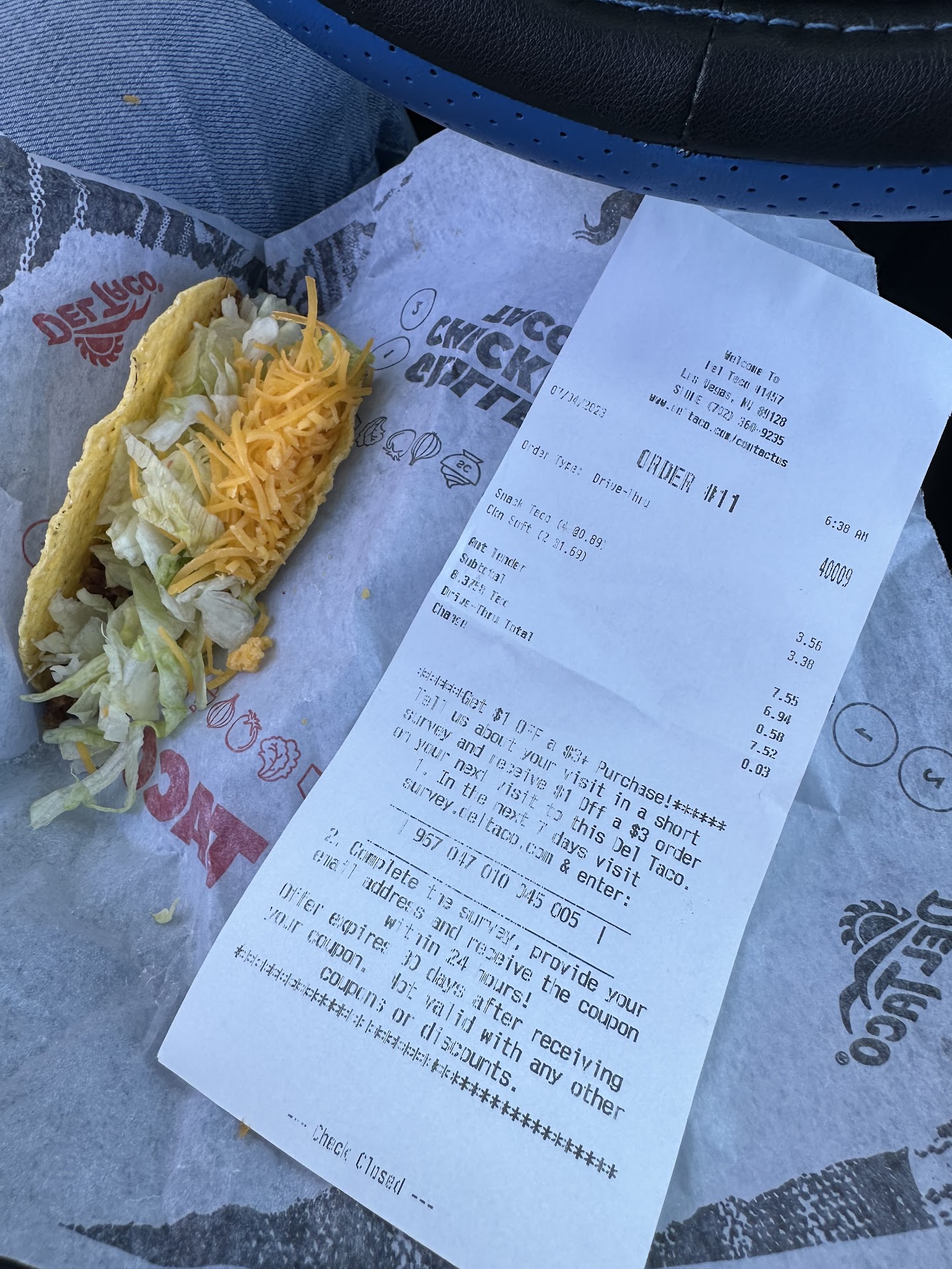 Read moreI had never eaten at Del Taco before since Wisconsin -- and the Midwest, as far as I know -- doesn't have any of these restaurants. I only knew of their existence by references to them from "Big Bang Theory" and so, when I saw one within a few blocks of my son and daughter-in-law's apartment in Las Vegas, I decided to give them a try. To me, Del Taco strikes me as somewhere between Taco Bell and Taco John's -- more flavorful than Taco Bell and not quite as 'zingy' as Taco John's can occasionally be. The Taco shells were nice and crispy and were actually filled-up, something that I'm not really used to around home when it comes to Mexican fast food. There was actually so much cheese that fell out of my tacos and onto the wrapper that I needed to get a spoon from a cashier to scoop it all up...and no, that is NOT an exaggeration. It was nice to finally try this place but now that I know how good their food is I'll have to admit to being disappointed because there aren't any around here for me to patronize.