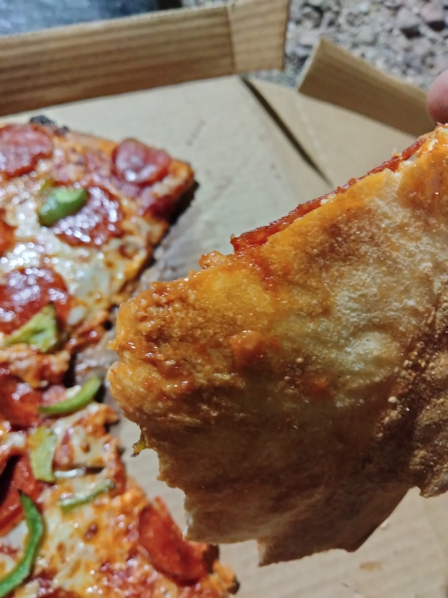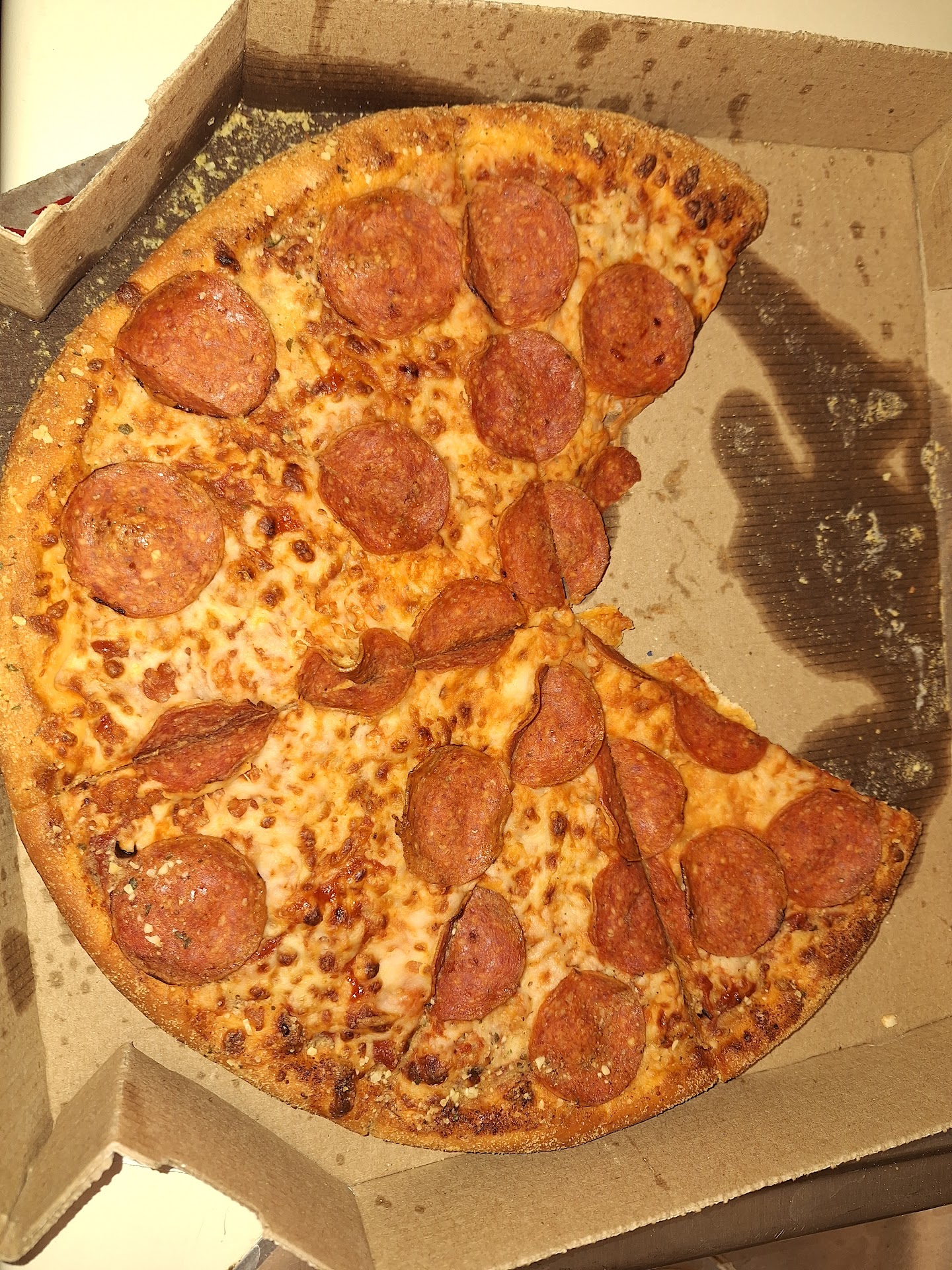 Read moreThis location is awful. Be forwarned if you order your pizza with extra, be prepared to be disappointed! I'm looking at my pizza and if I wasn't so hungry. I'd throw it away! I ordered a pepperoni with EXTRA CHEESE. Lol, what a joke. They're always out of their garden salads. The delivery driver shows up with your order. Then says "oh by the way, we're sold out of the garden salad." Common sense would tell you, let me call the customer before the driver leaves. Let me notify the customer we're out of the garden salad. We could send you the chicken Ceasars salad, or we can give you a credit for next time. That should be the protocol, instead of showing up at your door to tell you "we're out of the garden salad." This has to be one of the worst locations ever. In the two photos I took, one is without the flash. The other photo I took without the flash. Mind you, this pizza should be a pepperoni with EXTRA CHEESE! Look how awful this pizza looks. They should be ashamed to even send anything out of their store, looking this...