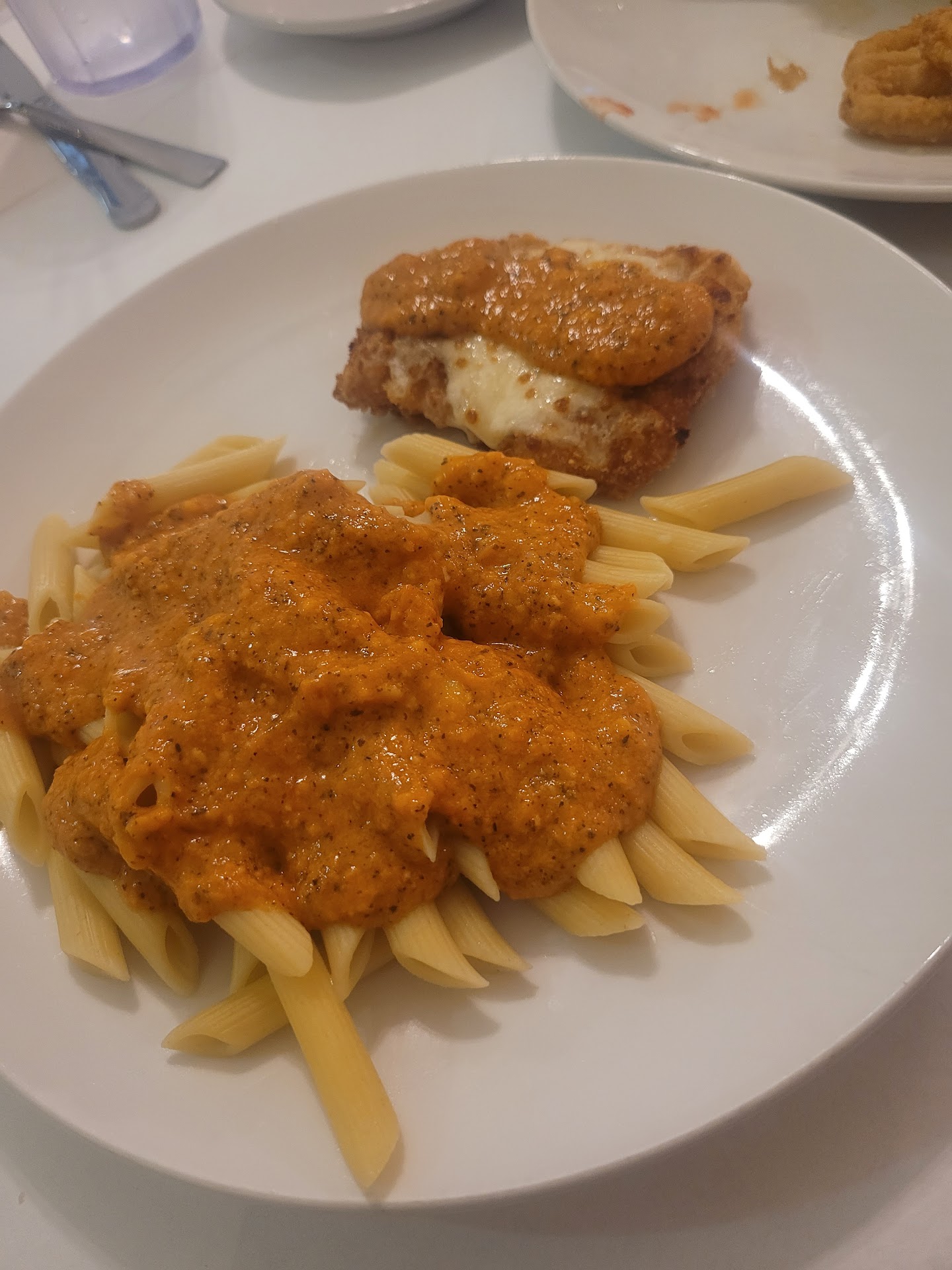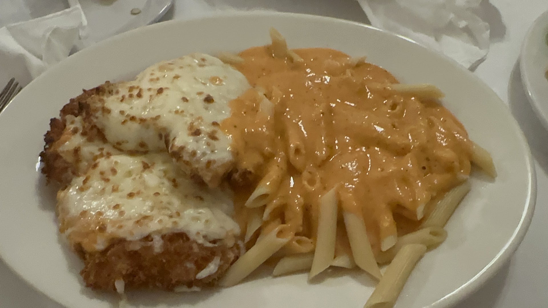 We arrived at 6pm no reservations and were the only there so we were immediately seated. Our server was Kara (or close I’m sorry if I got it wrong) who was absolutely amazing. She was friendly, attentive, was patient explaining the menu, and continued to check on us. We ordered, the garlic bread with cheese, Caesar salad, meatball, chicken parmesan with penne vodka, and the chicken chature I believe that’s what it’s called. Side note; they offer happy hour prices from 4-6.