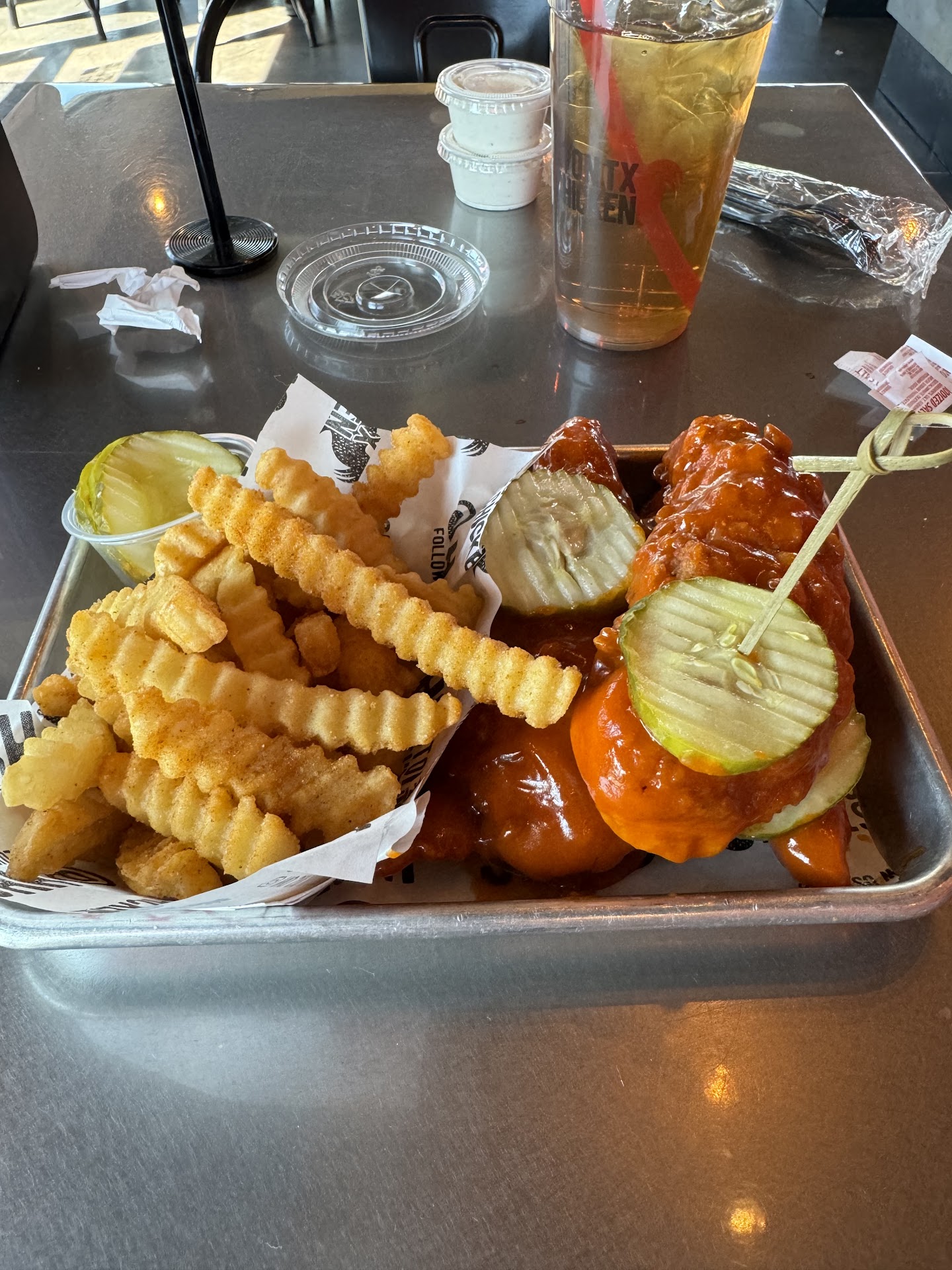 I ordered the House Favorite (Original Hot Chicken Sandwich, Tender, and Fries), plus a drink. The menu wasn't too difficult to choose from, but since this was my first experience here, I still had a hard time choosing what I wanted to try first because I wanted to try everything on the menu. In my younger days, I would just order 2-3 different items to try at once, but since I've gotten older, that's a little more daunting. Oh well, looks like I'll have to return for round 2 to try other items on the menu. The chicken itself was phenomenal! The sandwich was a perfect blend of sweet and savory flavors which provides you an intense experience like no other. I know there are several chicken restaurants in this city to choose from, but I can honestly say that this place is ranked way up there for me. I was very satisfied with my food, yet I was kind of disappointed after I was done with the final bite of my sandwich.