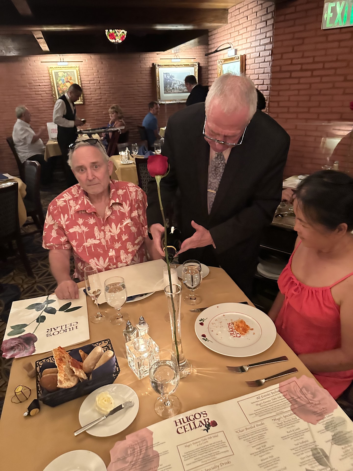Read moreWe came here to celebrate my wifeâs birthday but she became ill at the last minute so we went ahead & promised to bring her home something. My brother and his wife sponsored the event as a thank you for their stay with us as they live out of town. The ladies at the hostess stand were very nice, validating our parking ticket for us, & in Hugoâs well known tradition since they opened in the mid 70âs, presented my sister in law with a beautiful long stemmed rose. We were seated at a nice 4 top immediately. The party next to us were drunk, slurring, & laughing loudly. Annoying, but we decided we would stay put & tolerate it. Thatâs not the restaurants fault. Our service team consisted of Ahmad, Pete, & 2 others. I canât remember their names but one was the Sommelier, & the other was a big guy who ran the table side gueridon cart. He looked a little disheveled with an untucked shirt, but he was a funny guy. He handled our salad choices smoothly & later impressed us with his mastery of the cherries jubilee presentation. Pete was attentive to our needs, & Ahmad took our appetizer order. Our Sommelier chose a very nice bottle of J cuvĂŠe sparkling wine. We appreciate the fact that he chose something that was a great match with our appetizers, & not too pricey. The crab cakes were outstanding, seasoned with just the right combination of spices, not too much breading, which is the biggest disappointment of crab cake aficionados everywhere. The remolade sauce was superb, a touch of Colemanâs mustard and red pepper were detected. Unfortunately, the escargotâs were disappointing. The concept was great; (puff pastry & the cast iron dish presentation) the execution not so much. If thereâs one thing that personifies escargot, itâs that garlicky parsley butter. Hugoâs butter had neither. I tasted some paprika but that was all. In fact, Iâm guessing that the butter was actually a blend of drawn oleo & butter because I detected no milk solids in the blend, & the butter flavor just wasnât there. It was oily & bland. The entrees were ordered, & our Sommelier again flawlessly presented a wonderful house Shiraz that he chose for my sister in law to accompany her rack of lamb. What a perfect match. My brother ordered the filet mignon medium rare, & I ordered a NY Strip charred medium rare. Ahmad suggested the potatoes au gratin. They were beyond excellent, both in presentation, texture, & flavor. Both steaks were the perfect temperature, & both had a wonderful aged flavor. My NY steak wasnât charred at all though, in fact, the filet had more char than the NY, but I donât like sending food back so I ate it & I enjoyed it. The rack of lamb was tender & flavorful too. The accompanying bearnaise & au poive sauces were just ok. I think they may be from a package. They certainly werenât made to order. Back to the dessert course. I mentioned to the sommelier that my wife, whose birthday it was, wasnât in attendance & would he please cancel the whatever it was that they do for birthdays? He said ok, but something got lost in communication & out came our server, presenting a piece of lava cake & ice cream with a lit candle. It was a little awkward, but we had fun with it, softly singing the birthday song to my wife & blowing out the candle as the phone video was recorded for my under the weather wife to view when we got home. The cherries jubilee were fantastic, & so were the complimentary chocolate dipped strawberries that were presented. I had a cappuccino which was warm, not hot, & a little bit too sweet for my taste. Pete, our assistant server, was awesome. He appeared as if on cue & our sommelier was attentive, getting me a replacement napkin for me without being asked when I accidentally dropped mine. Ahmad, the big guy team were pro. Overall I give Hugoâs 4 stars. The small things matter when one is paying this much for a meal, & Hugoâs, while good, didnât quite meet our high...