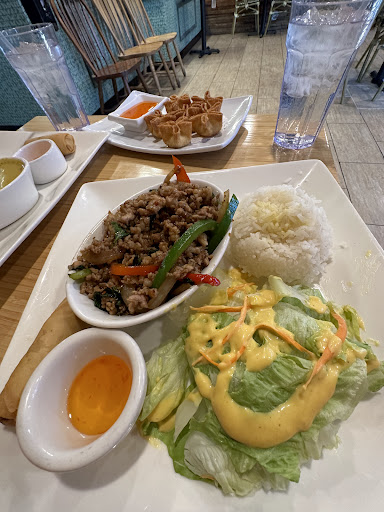 Great food and customer service! This was my first time visiting this Thai Restaurant. I was immediately greeted by a friendly waiter who invited to sit down anywhere. He handed me a menu and I didn’t have to wait long to get my order taken even though he seemed to be the only waiter. The restaurant had at least 4 other tables of people eating but everyone looked happy and the waiter wasn’t rushed. As I looked at the menu a customer came to counter to pay his check and kept complimenting the restaurant staff for the fresh and delicious food, saying they will definitely be bringing their family back. (Perfect timing! They didn’t even know I was a Google Maps Contributor so it was an honest review) I personally appreciate that I was asked right away about my spice level preference. I ordered the Spicy Basil lunch special - spice # 7. I like spicy food and it was perfect for me! The portion was good and I ended up ordering another cup of rice to finish all the delicious sauce leftover from my spicy basil dish. I will be back to try the other...
