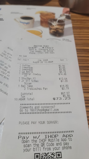 This IHOP was not at all like the ones I ever been to in the passed I took my mom out to eat and we came in the waitress seats us my mom and I talk but then I noticed the waitress seats another pair of ppl and started talking their orders first she laughs as she finished up with them then brings us water an ask are u ready so at this point we are not understanding the process ...and kinda not sure if we are going to order but my mom was hungry so we did (my mom) orders a turkey club I order a make your own omelette it take a while we see the other ppl get their food before we do so needless to say we was not happy but when the waitress (Kalie) brings the turkey club out it has no mayo on it when my mom ask why it has no mayo she (Kalie) say we don't have Mayo then she Rambo s off a list of other things to put on the club ..ranch mustard blue cheese thousand Island dressing my mom say why would I want any of that ....the (Kalie) says again would you want like ranch mustard blue cheese thousand Island dressing then walks away ...at this time I haven't received my omelette yet it's been 20 mins at this point ...so my mom and I laughed about the club and no mayo my food comes out and it's a lil passed golden brown but I eat it egg was so over cooked I couldn't cut through it wit my fork smh so I didn't complain so at this point I'm like lets just go my mom ask for the club to be taking off so Kalie the waitress goes to update the ticket we go to the register and Kalie ask cash or card ...I say card at this time my mom says to her maybe should tell ppl that you are out of mayo if it comes on the sandwich the young girl has a slick tong and keeps cutting my mom off with an slick word or two try to do that nice nasty stuff....and she said there was no acting manager on duty found out she was the acting manager herself.., we will never eat their again...IHOP will never see touch or smell our money again if I could give no stars I would ........ Located on rainbow...