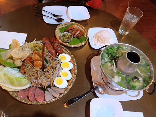 Our seafood Po-Tak hotpot was a masterpiece, filled with large mussels, prawns, cuttlefish, and a flavorful broth packed with spices and herbs. The big tray papaya salad, served with rice noodles and an array of sides like boiled eggs, Lao sausage, and fermented cabbage, was simply outstanding. The crispy pork belly and its dipping sauce were equally delicious.