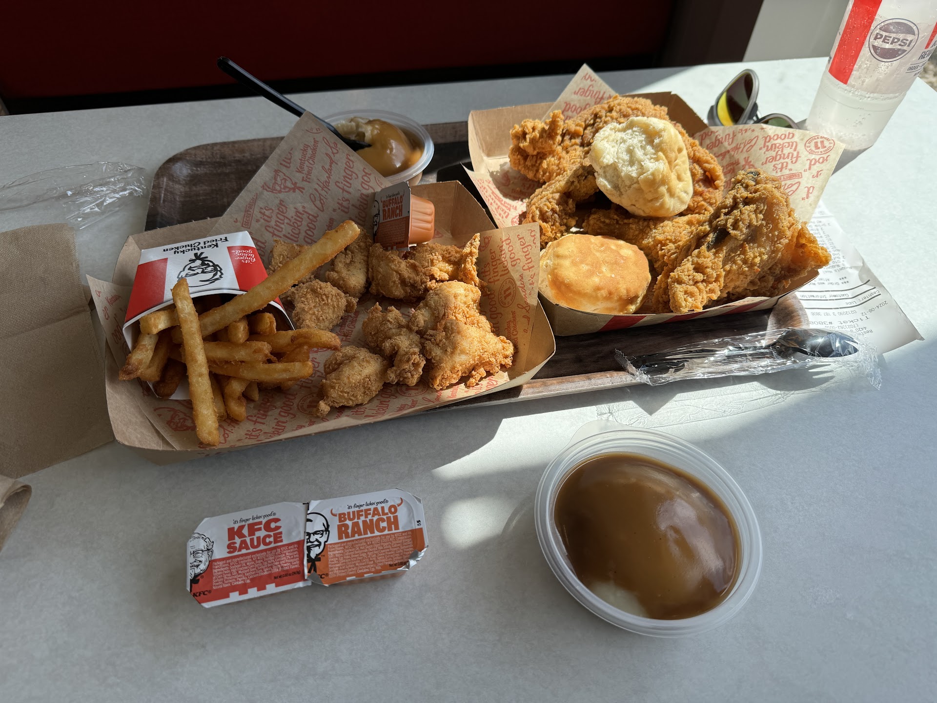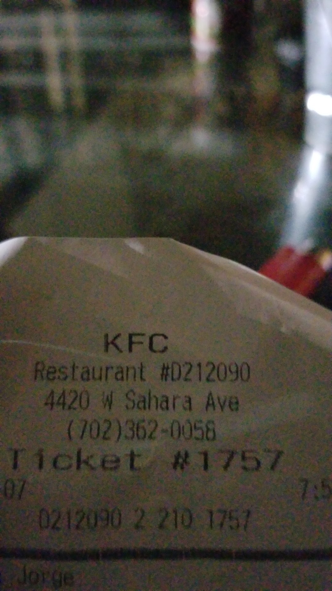 Read moreI went to try the new chicken tenders today. I ordered the 3 strip meal but I got home and I had bone in chicken. I go back and they replace the order. Get home and guess what THERE IS A LONG BLACK HAIR IN THE BOX. I go back for the second time and go inside. I ask to speak with the manager. The black lady that is working drive thru and front counter says what can I help you with. I asked if she was the manager. She responds again with what can I help you with. I told her that there is a long black hair in my food and she looked in the box. She asked if I wanted a remake and a said no I want a refund. So then she takes the box to the MANAGER whom is working the line. She tells him that I'm saying there is a hair in my food and it's the same guy just returned his food. I can hear him from the front counter say "there is no way we didn't see that hair in the box before sending it out. He causing all this waste." I ask the lady what is he talking about back there. She said oh nothing he mad. So unprofessional! It was a Asian man with a glass eye. Didn't see no hairnets in use. Especially for the lady at the counter whom had long black hair that looked exactly like the hair in the box. Never eating at this KFC again. I think the hair was put in there because they was mad I returned the first order. After she did the refund I asked for a copy and she said nope gotta keep it for records but you can have the original receipt. Like she couldn't reprint it. The receipt she gives me is a duplicate receipt, go figure. The receipt was definitely not what I ordered but it was what I was charged for. I will be calling Clark county health department first thing in...