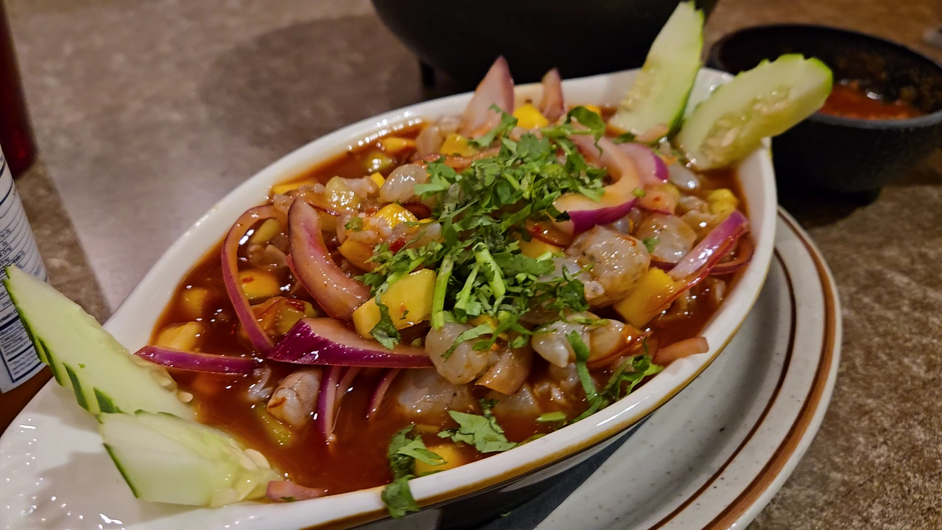 Ceviche Tropical: A hit! Loaded with shrimp, mango, cucumber, topped with cilantro and red onion, served with tostadas and crackers. Fresh and flavorful, it was the perfect appetizer.