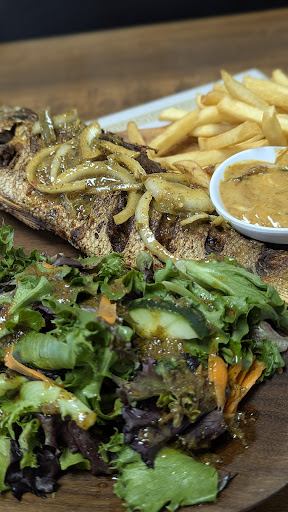 I love the Tchep with fish here. It is a Traditional and popular dish of rice, fish and vegetables. This dish started with a small mountain of joloff rice, and delicious well-seasoned stewed veggies and a large portion of fresh fish. This dish has the perfect amount of umami flavor and it's rustic, healthy and a very good bargain. Five stars.